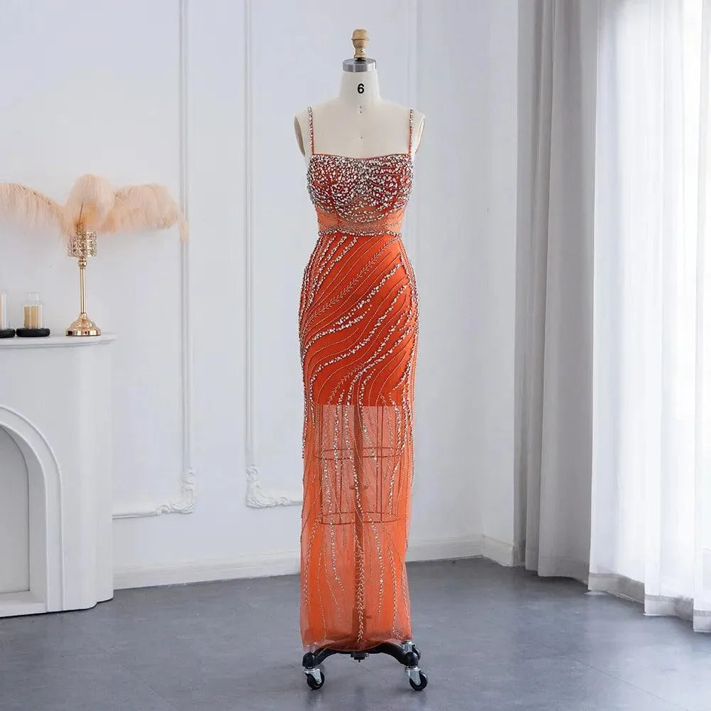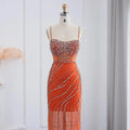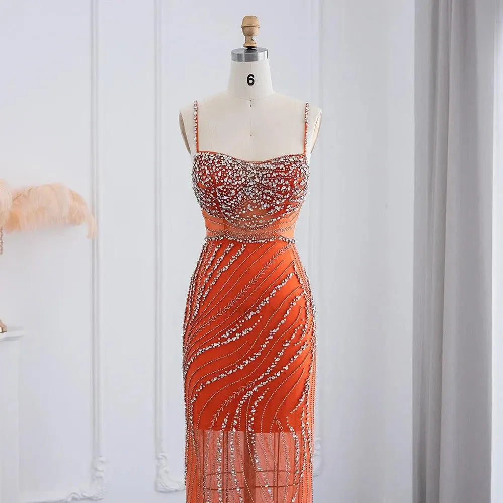 Orange Spaghetti Straps Mermaid Evening Dresses Luxury Dubai Crystal Long Prom Dress for Women Wedding Party