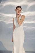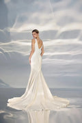Sleek Strapless A-Line Wedding Gown with Boat Neckline and a Natural Waistline for a Chic Minimalist Bridal Look