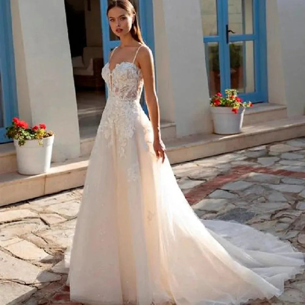 Spaghetti Strap Tulle Vintage Wedding Dresses Sweetheart Lace Appliques Beading Beach Bride Gown Vestidos De Novia