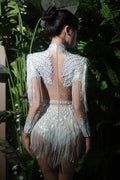 STOCK Red Women Long Sleeve Sexy Shinning Tassels Rhinestones Bodycon Bodysuit High Stretch Bar Dancer Nightclub Stage Wear