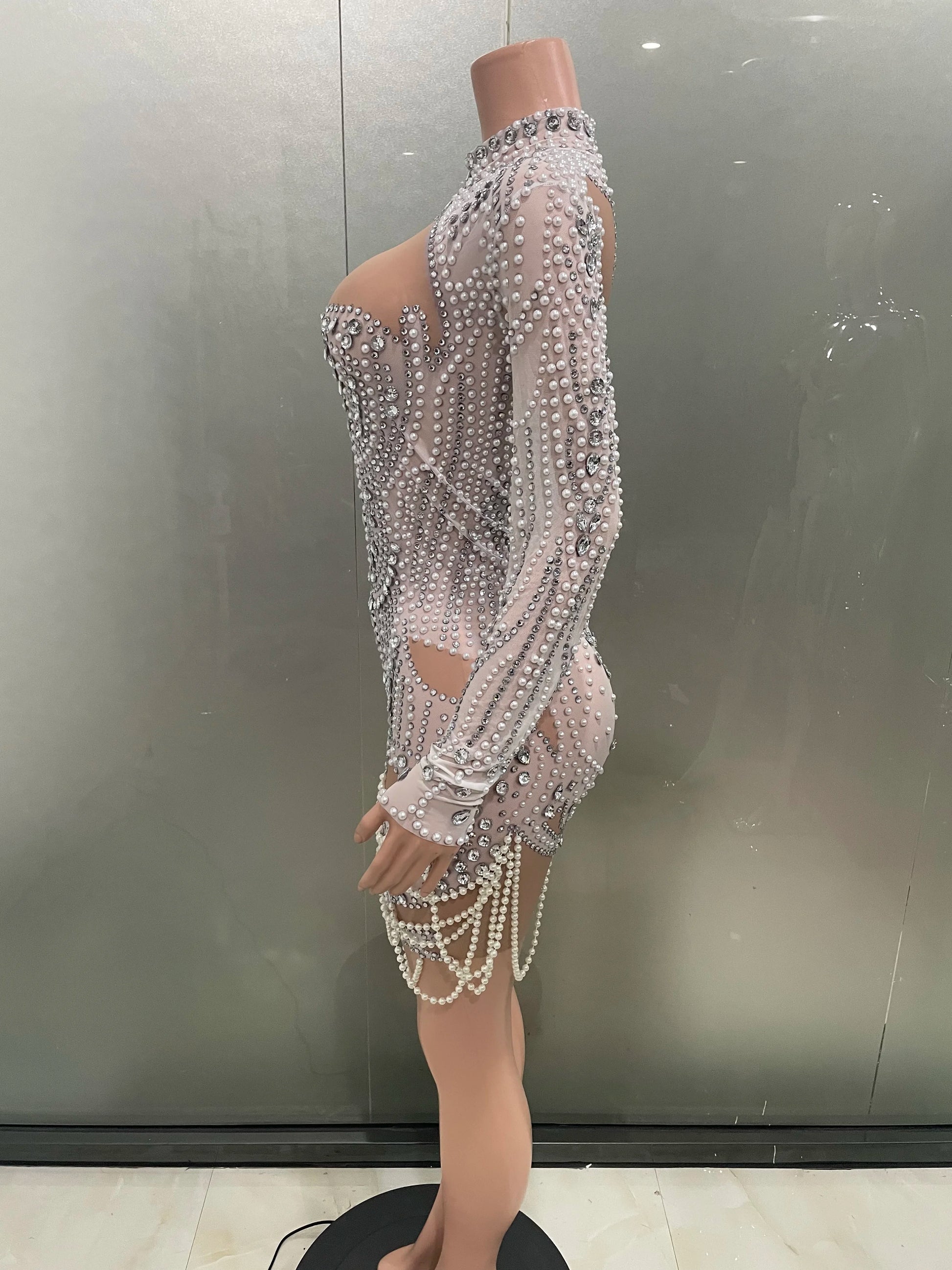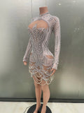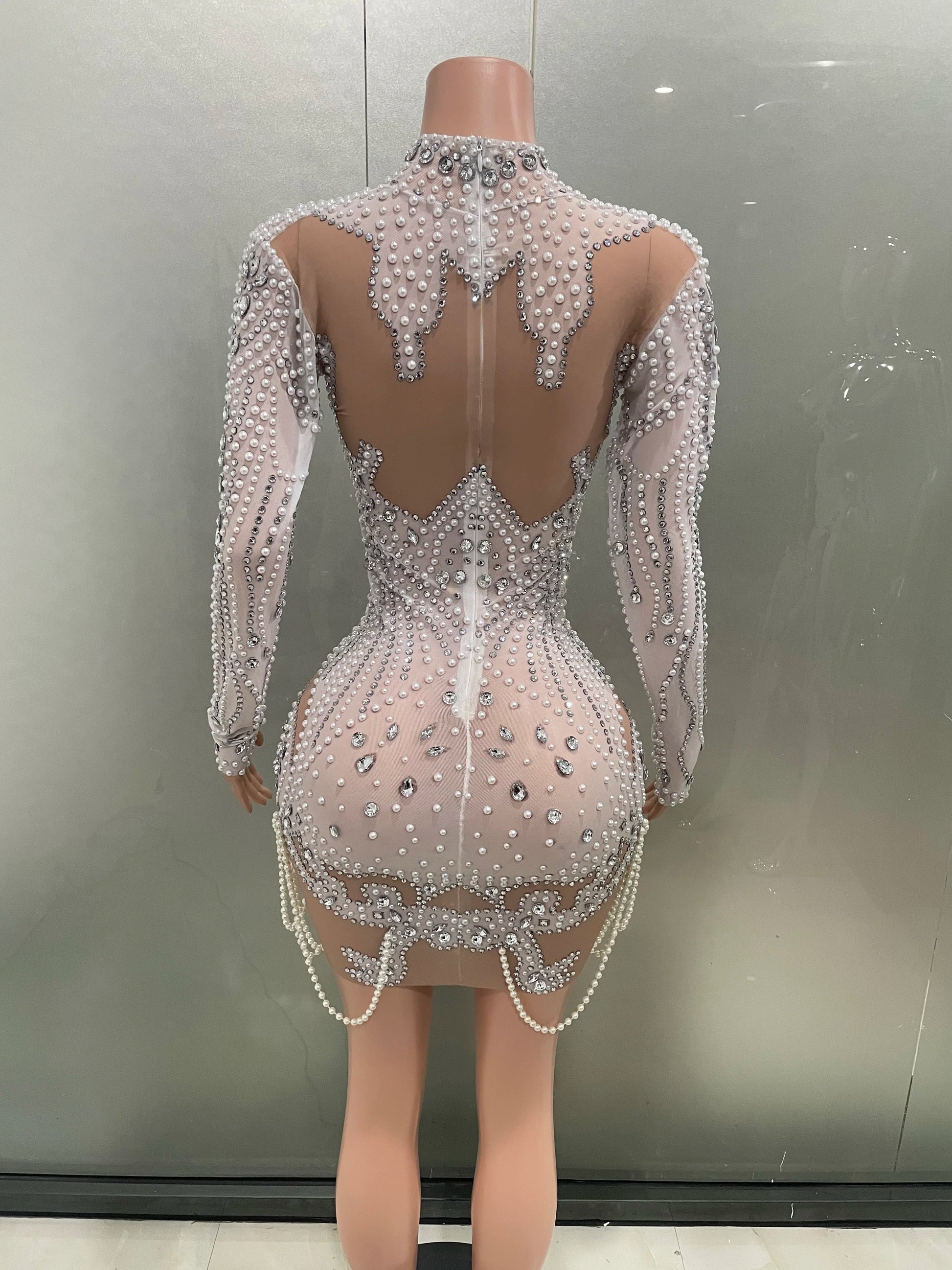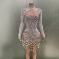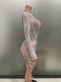 STOCK White Color Women Long Sleeve Sexy Mesh Beading Bodycon Mini Dress High Stretch Celebrate Birthday Party Dress