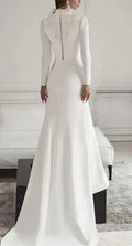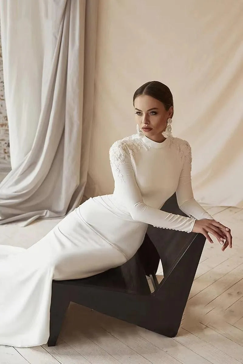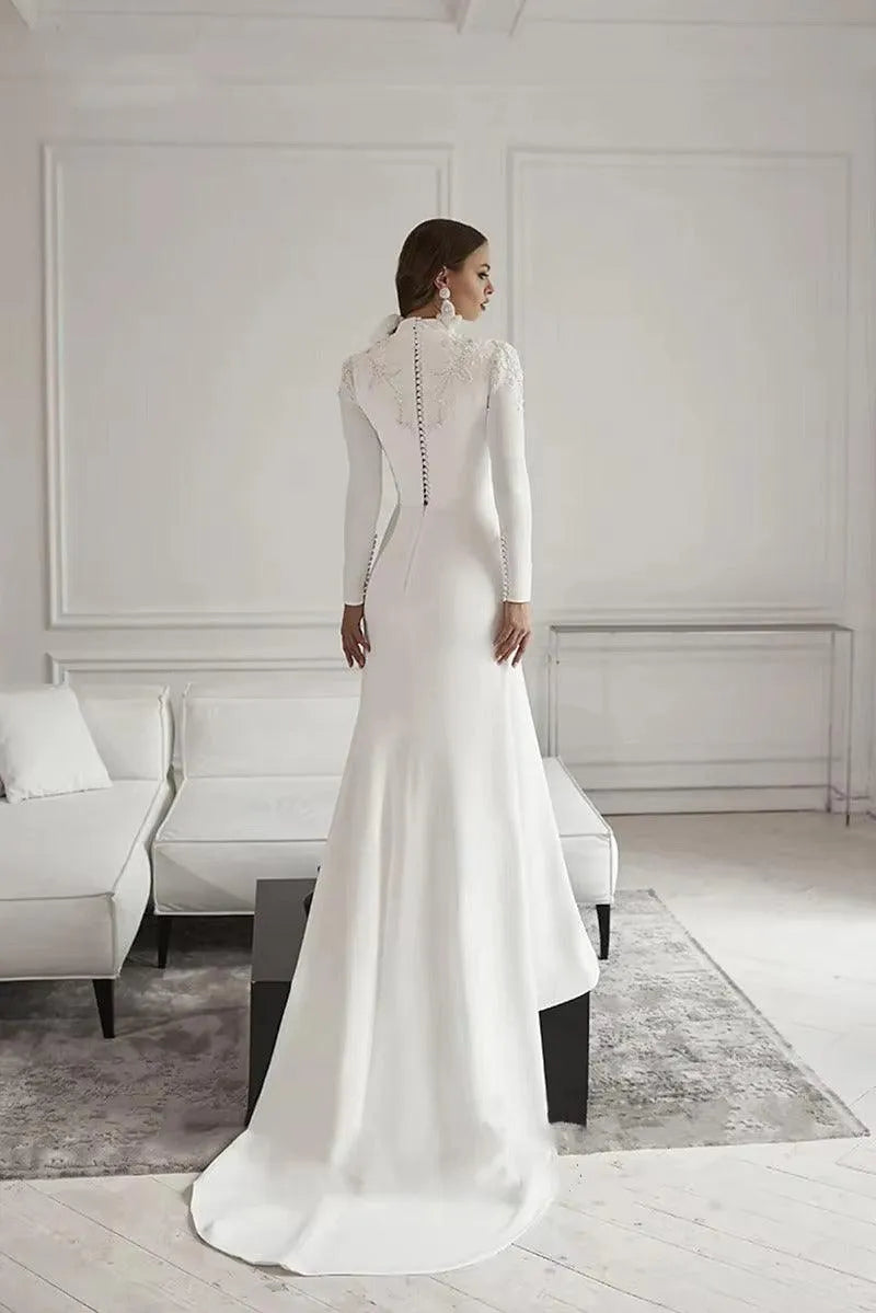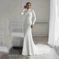 Vintage Long Crepe Wedding Dresses With Sleeves Mermaid Ivory Robes de mariée Button Back Sweep Train Bridal Gown for Women