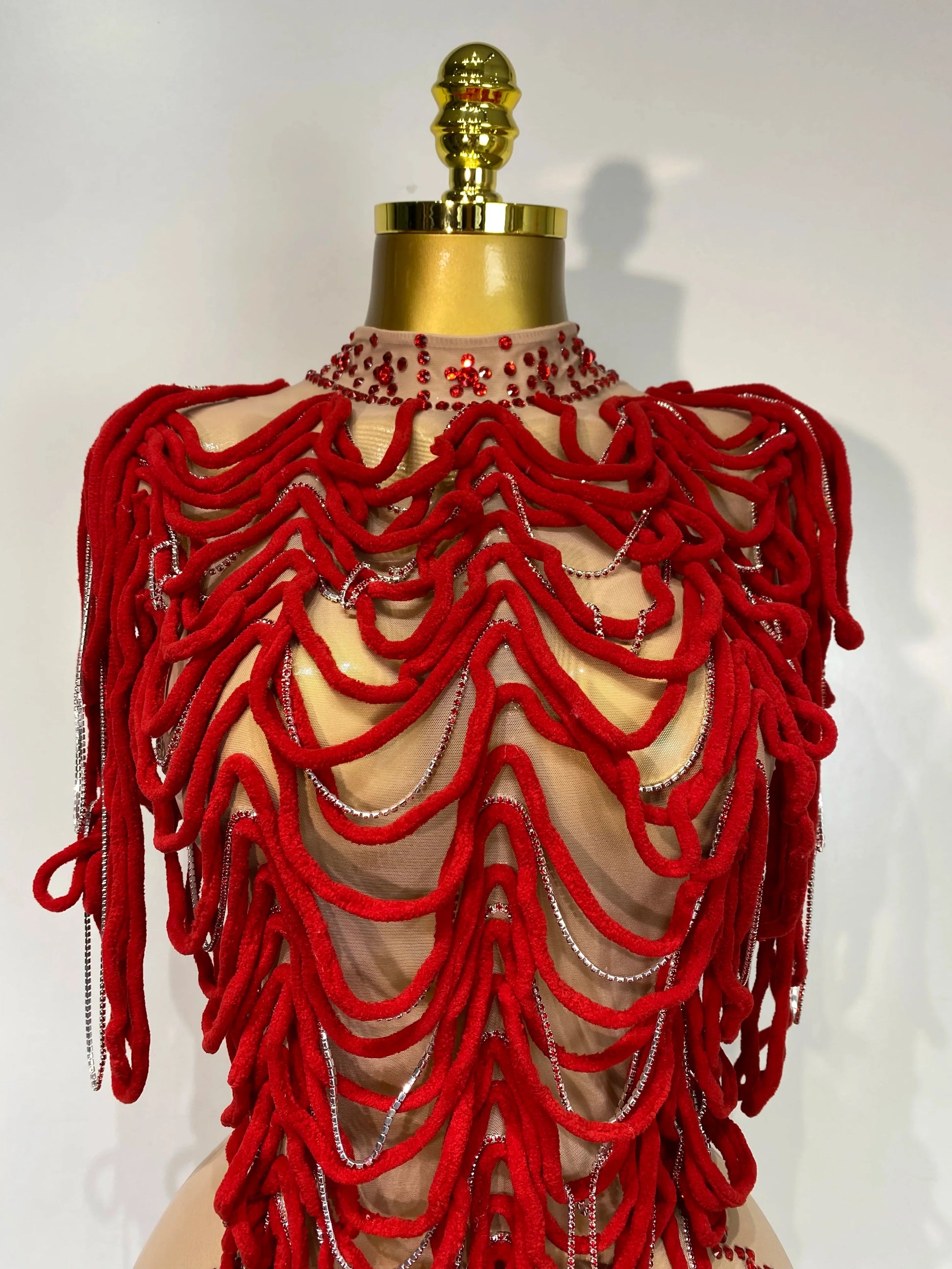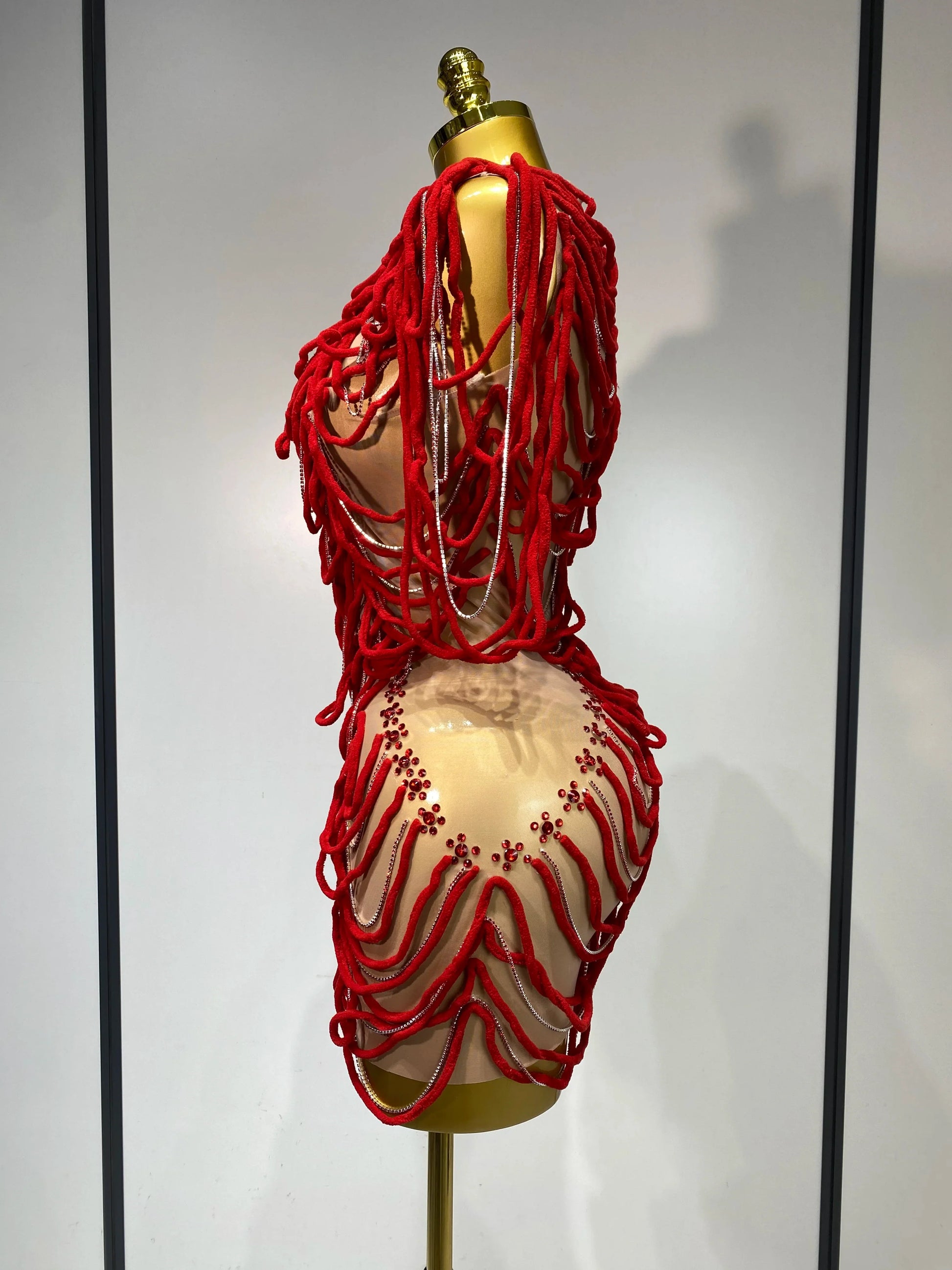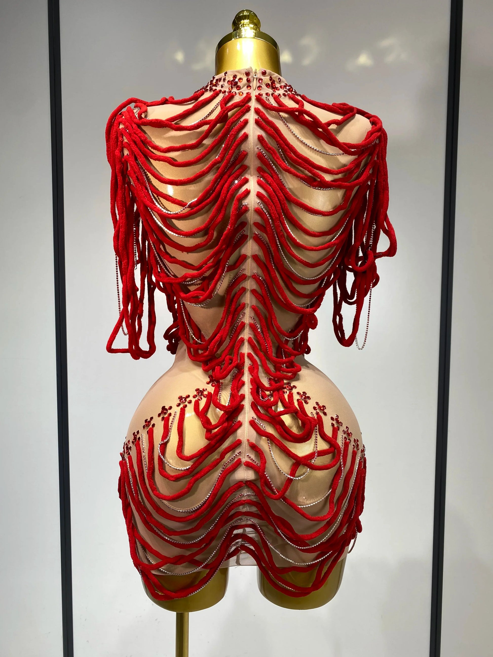 Women Mesh Elastic Sexy Tight Fitting Sparkly Diamond Chain Short Dress Nightclub Luxury Birthday Stage Performance Costumes