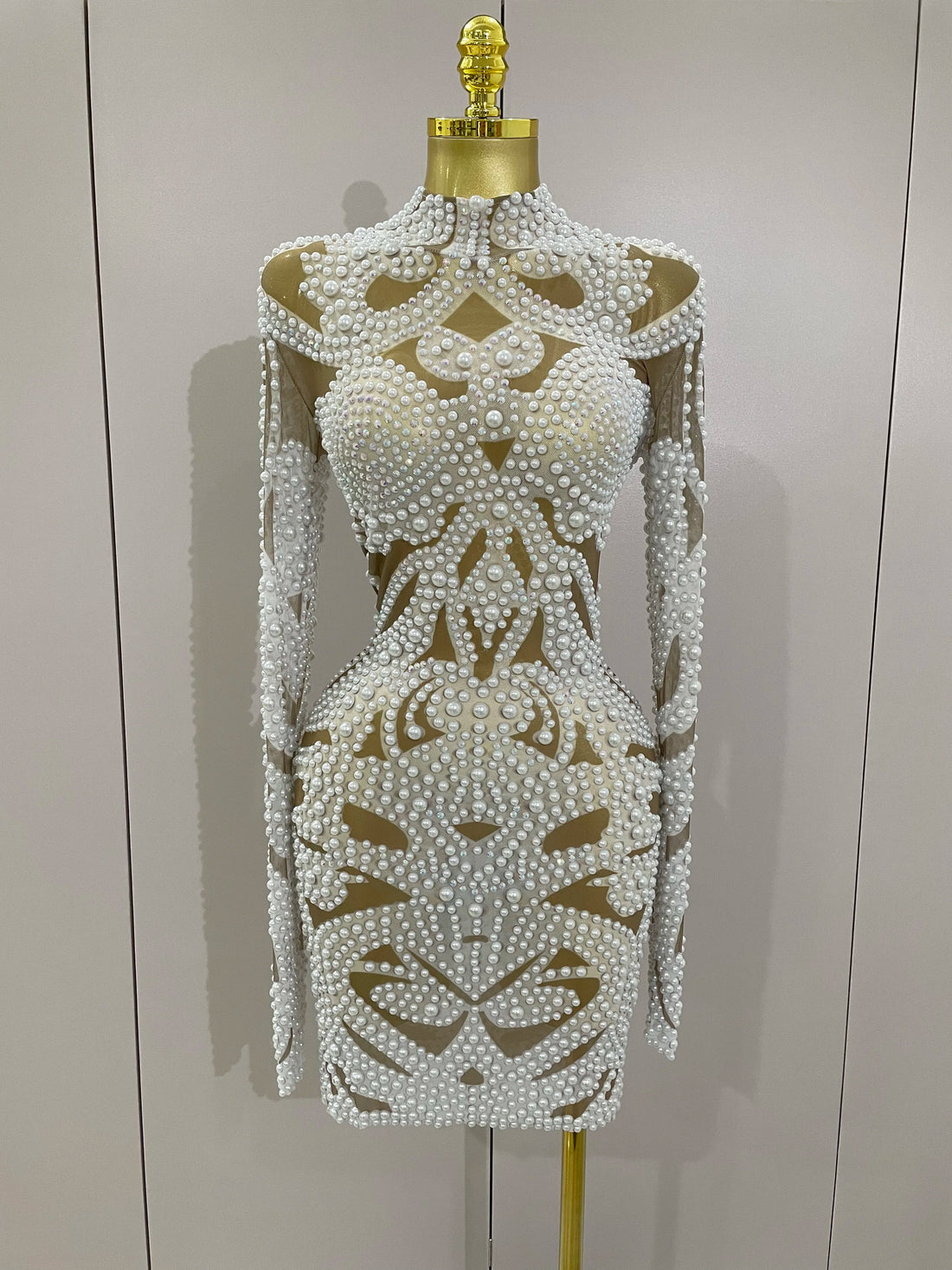 Sparkly Crystal Chains Pearls Long Sleeve Mini Dress 2025 Women Birthday Evening Party Nightclub Outfit Singer Wedding Costume