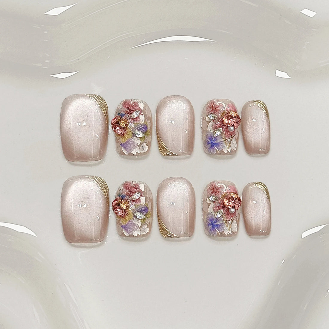 10pcs Crystal Cat Eye False Nails Colorful Mini Flower Fake Nails with Butterfly Design Elegant Press on Nails Short Square Nail