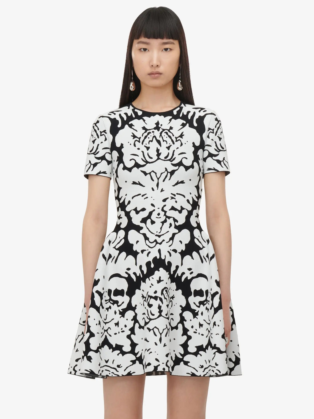 2024 Summer White Jacquard Leopard Pattern Slim Fit Bandage Dress with Round Neck Style Commuting Big Swing Knitted