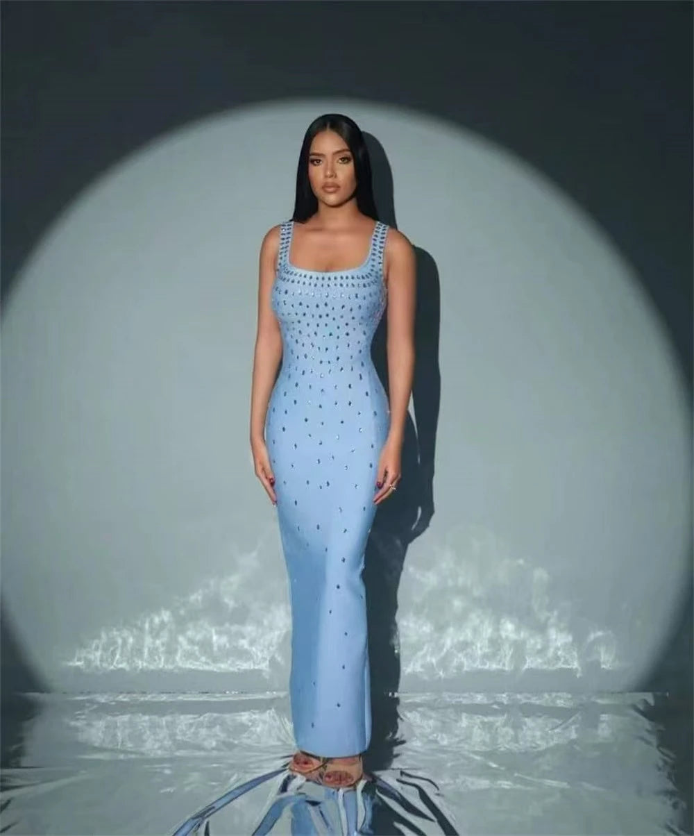 2023 New Women Sexy Diamond Embellished Bodycon Long Bandage Dress Elegant Rayon Backless Sleeveless Party Dress