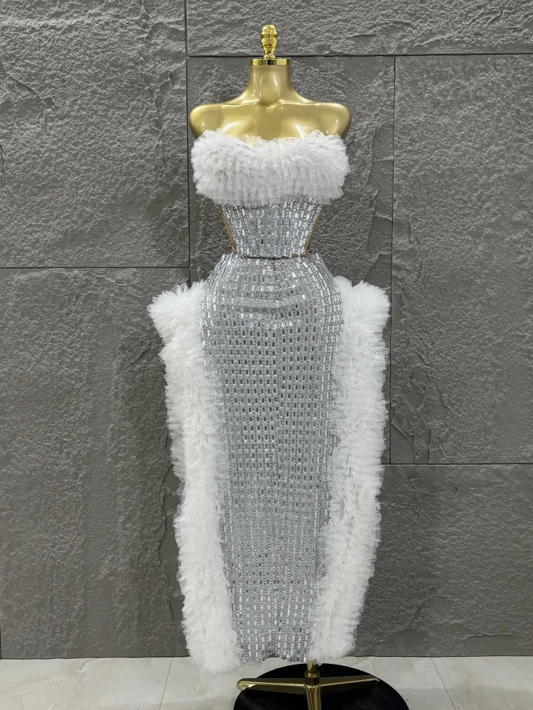 Sparkly Big Crystal Women Sexy Strapless Bodycon Mini Bandage Dress Fashion Nightclub Party Birthday Outfit Wholesale