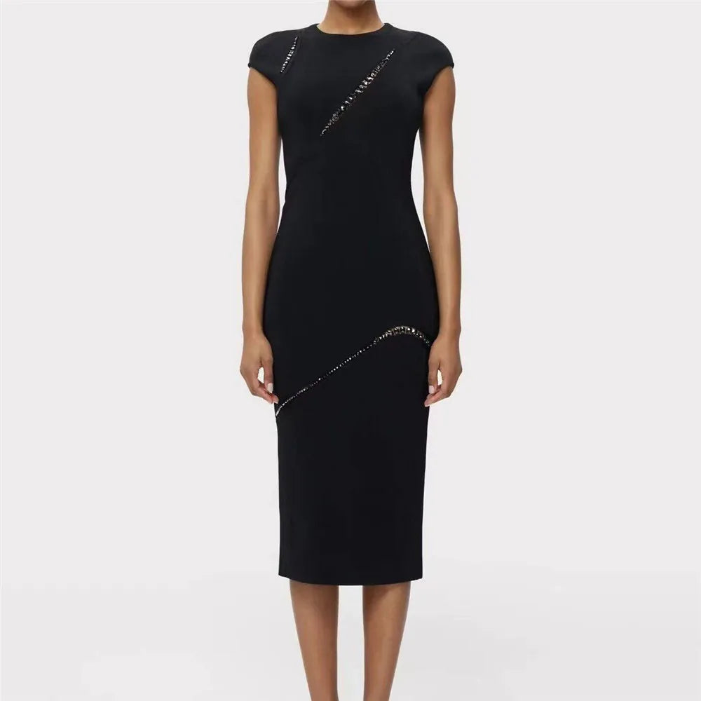 Black Color Women Sleeveless Sexy Shinning Crystal Bodycon Long Bandage Dress Elegant Evening Party Birthday Cocktail Outfit