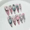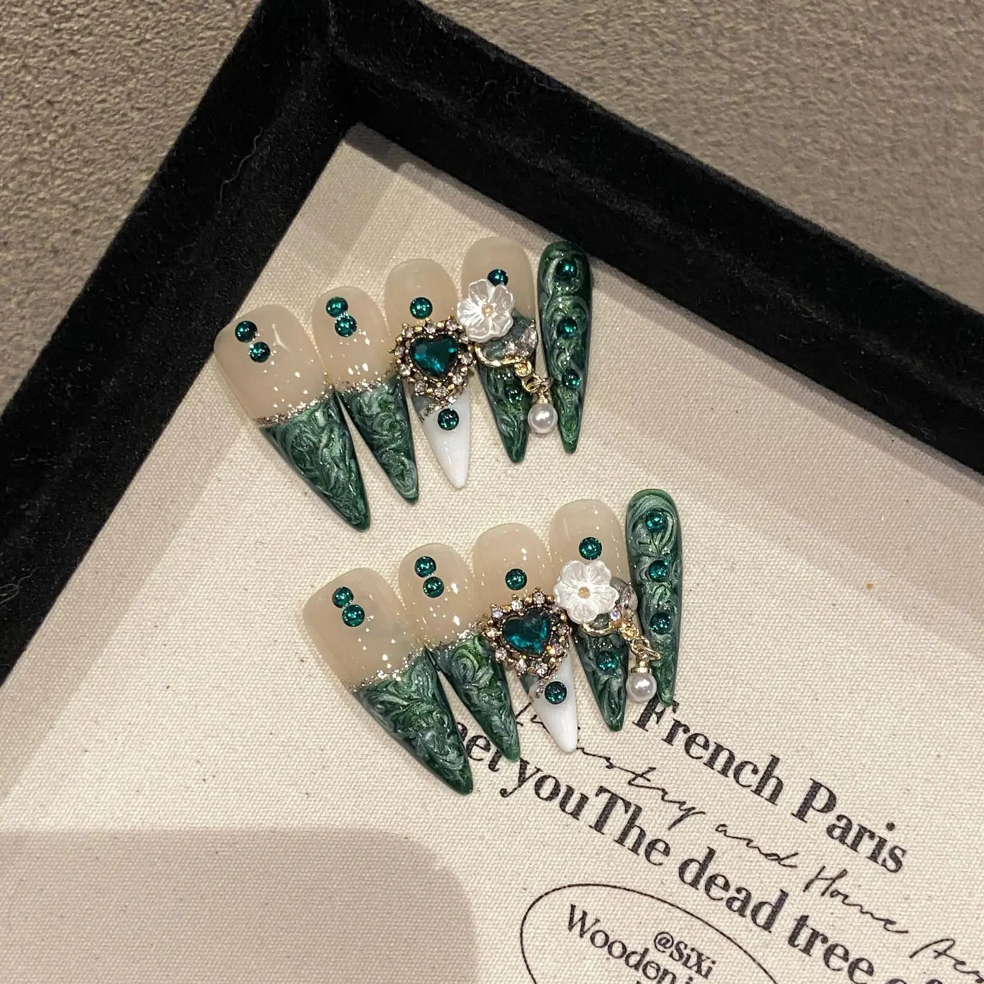 10Pcs Gold French Handmade Almond Press on Nails Ballet Rhinestone Full Cover Fake Nail Metal Manicure Wearable Nail Tips Art