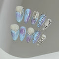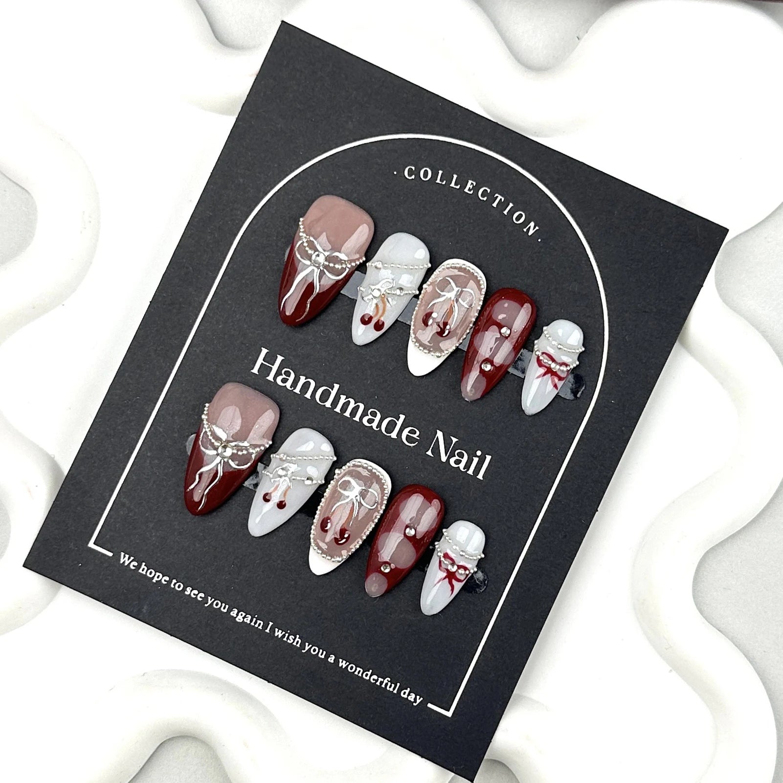 10pcs Handmade Press On Nails Baroque Bowknot Design False Nails Wearable Crystal Red French Almond Shaped Fake Nail Tips