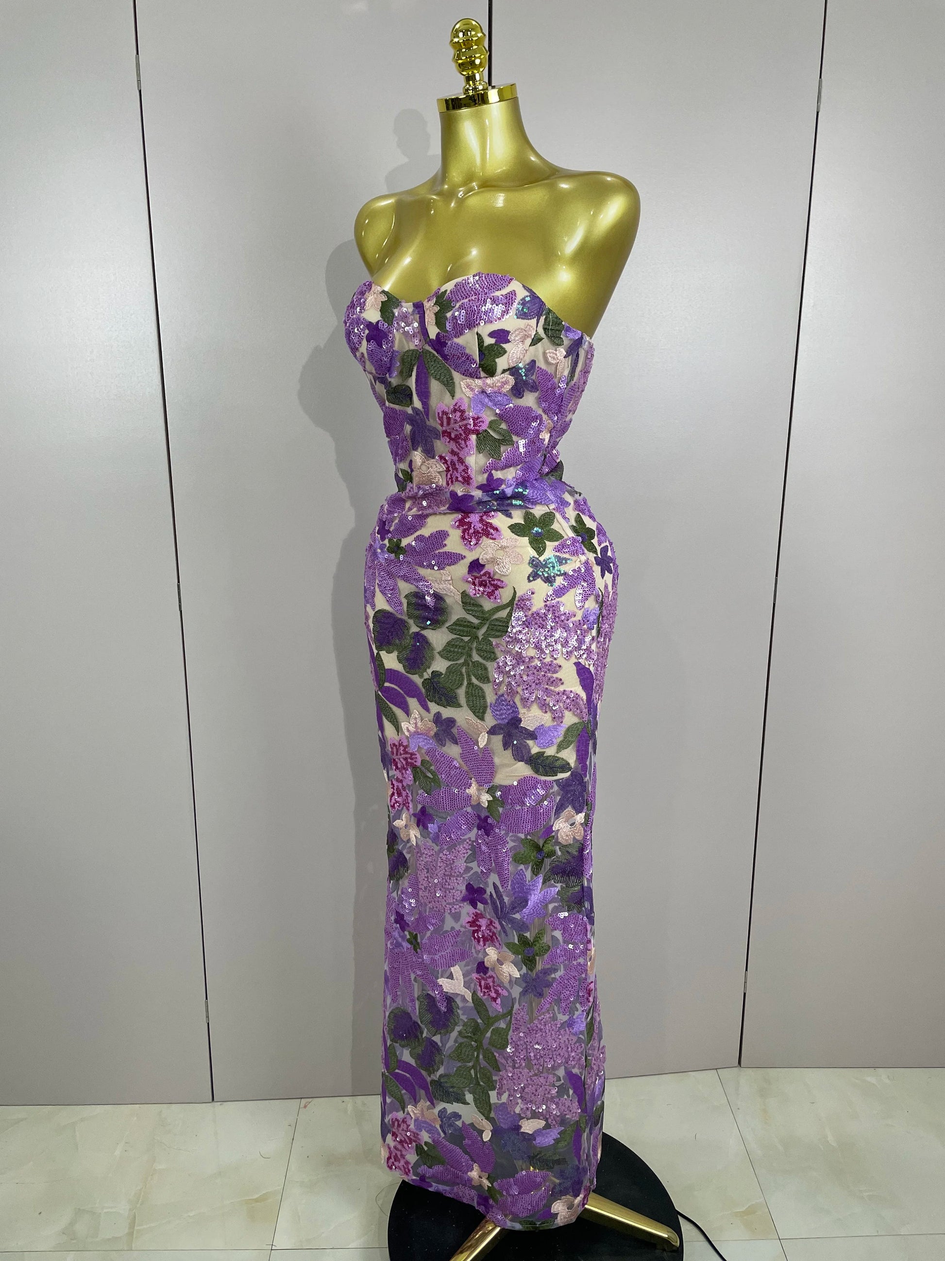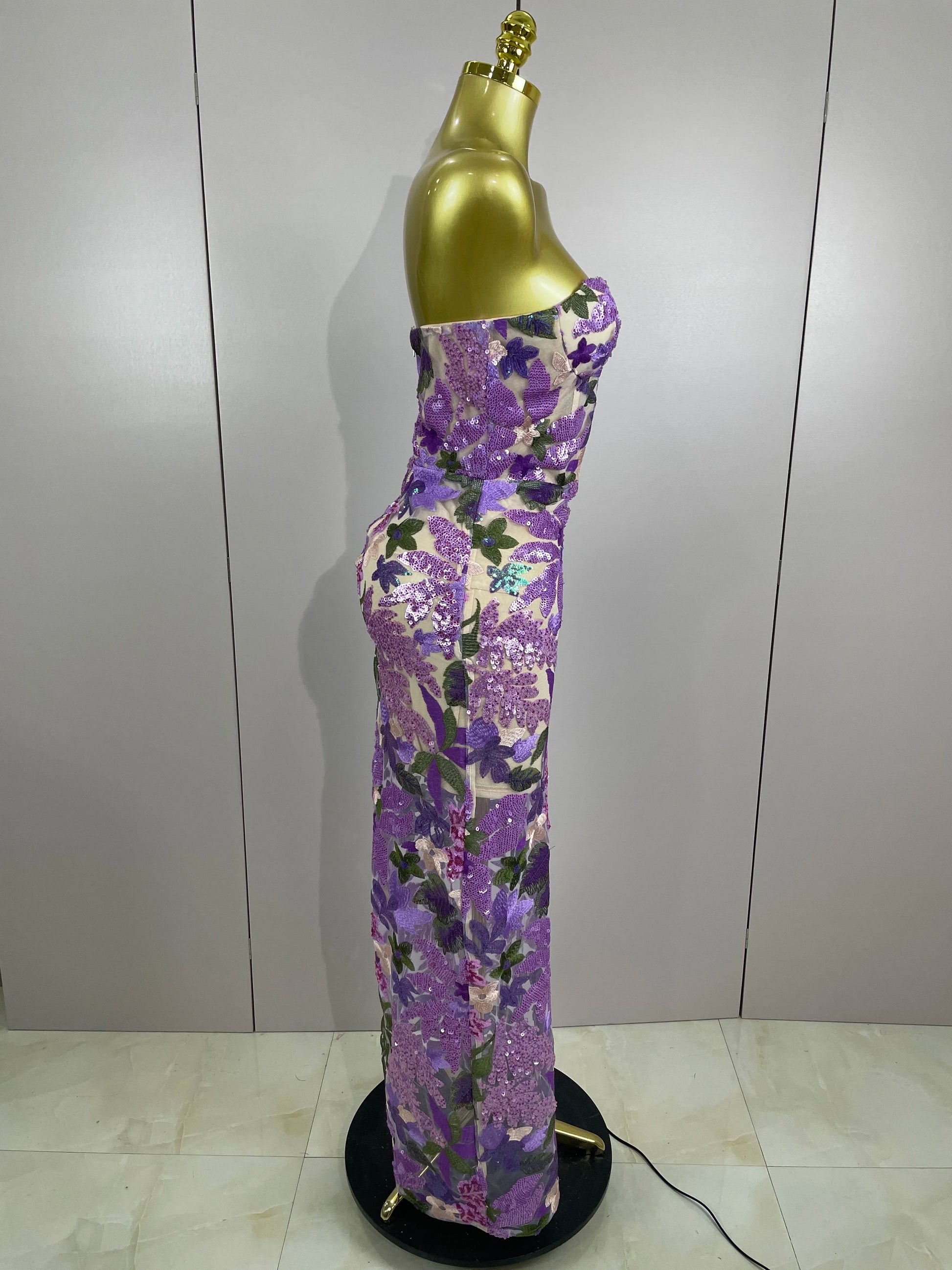 2025 New Sexy Strapless Floral Sequin Long Dress Women Sequins Flower Backless Long Slim Dress Evening Party Runway Gown Dress