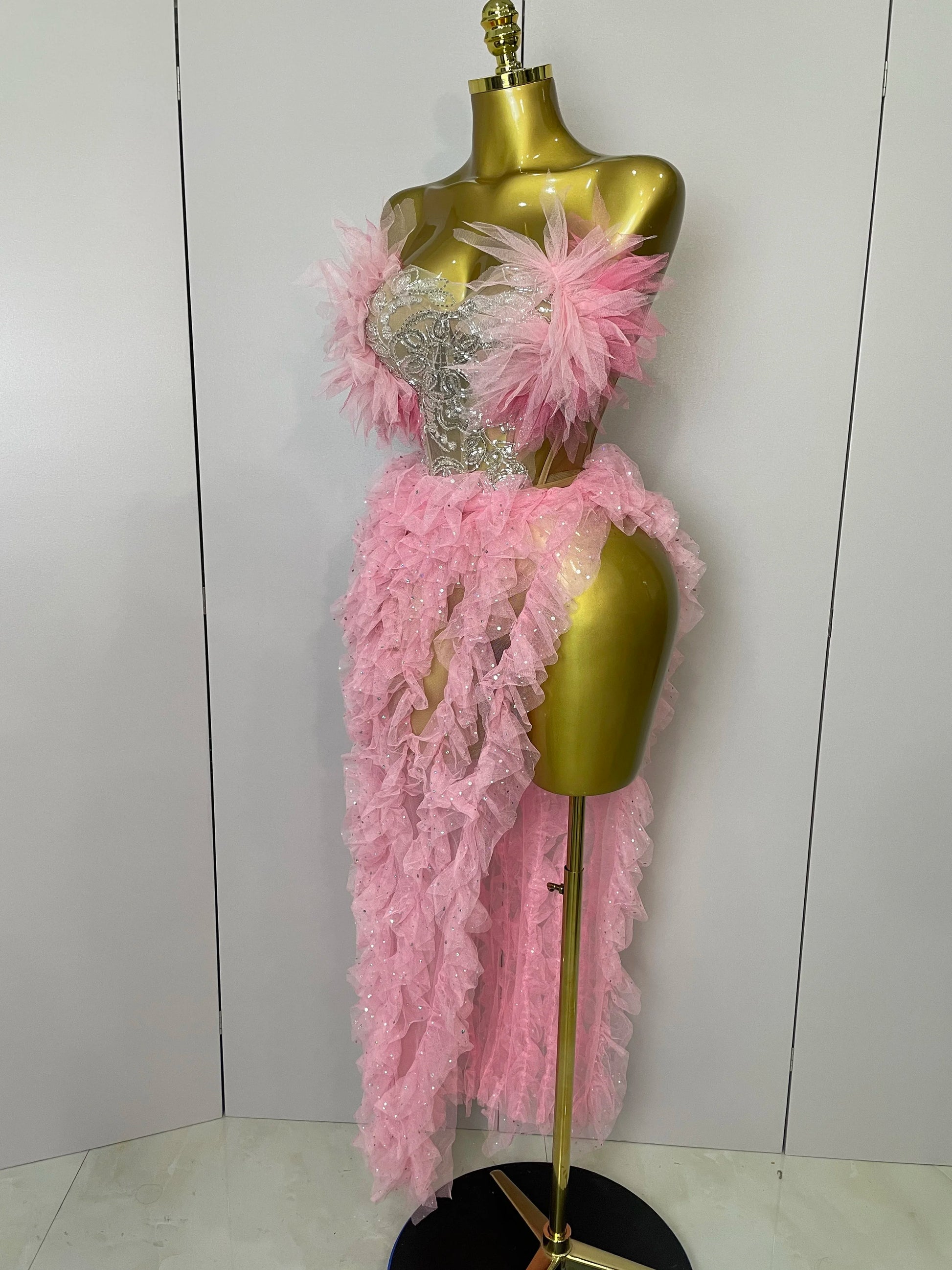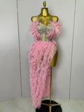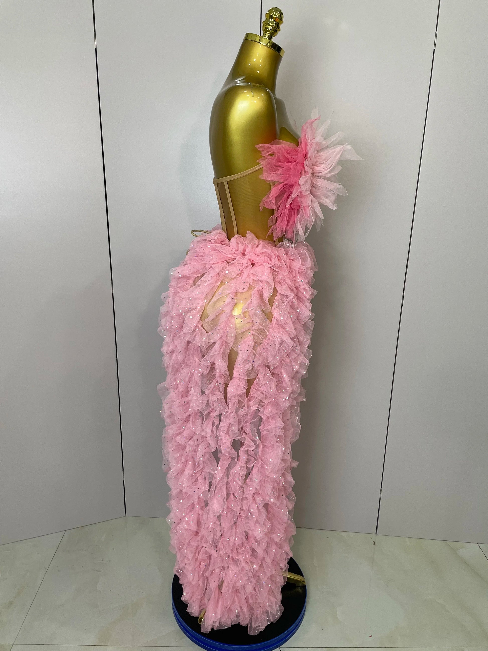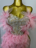 2025 Women Pink Ruffles Sexy Strapless Mini Tops 2 PCS Set Dress Nightclub Bar Birthday Party Evening Stage Performance Costume