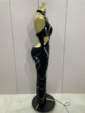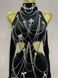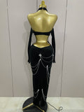 2025 Women Sparkly Diamonds Tassels Chain Balck Sexy Halter Backless Long Dress Evening Birthday Party Celebrate Stage Costume