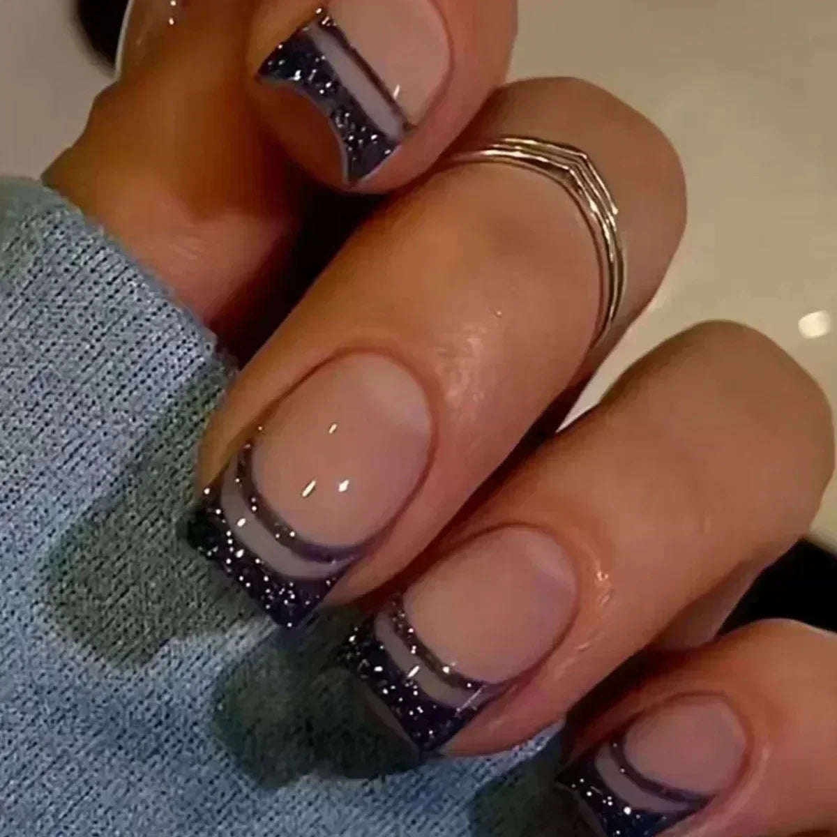 24Pcs Medium Short Square False Nails Glittering Nail Art White Wearable Fake Nail Silver French Full Cover Press on Nail Tips