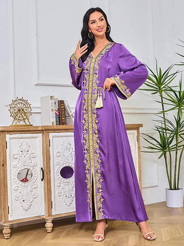 Abayah para mulheres Dubai chique sólido manga cheia decote em V cinto roupas elegante casual marroquino vestido longo