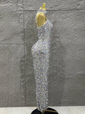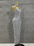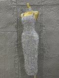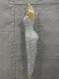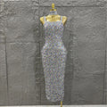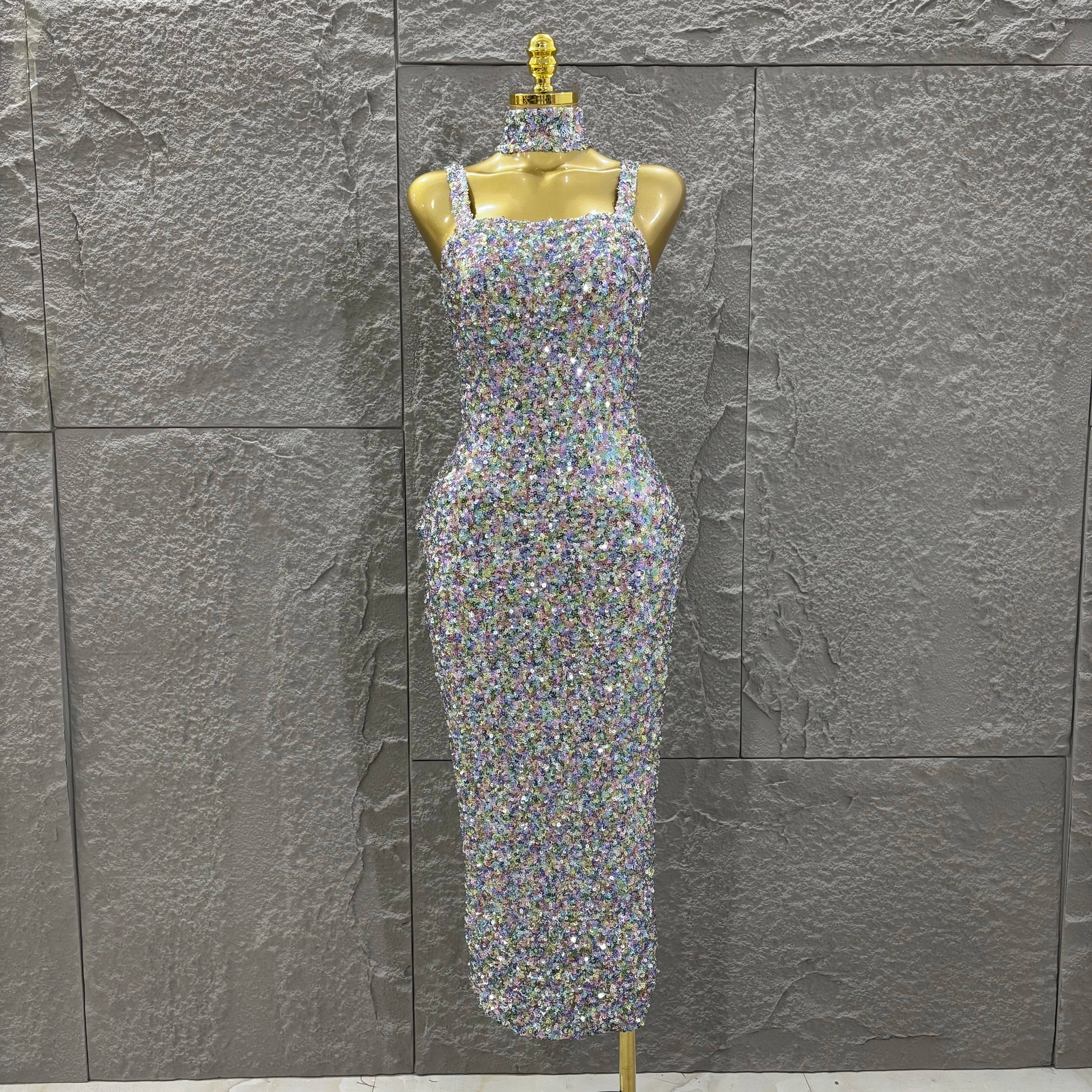 Colorful Sequins Women Sexy Strapless Bodycon Long Dress Necklace Celebrate Evening Party Nightclub Party Bar Singer Outfit