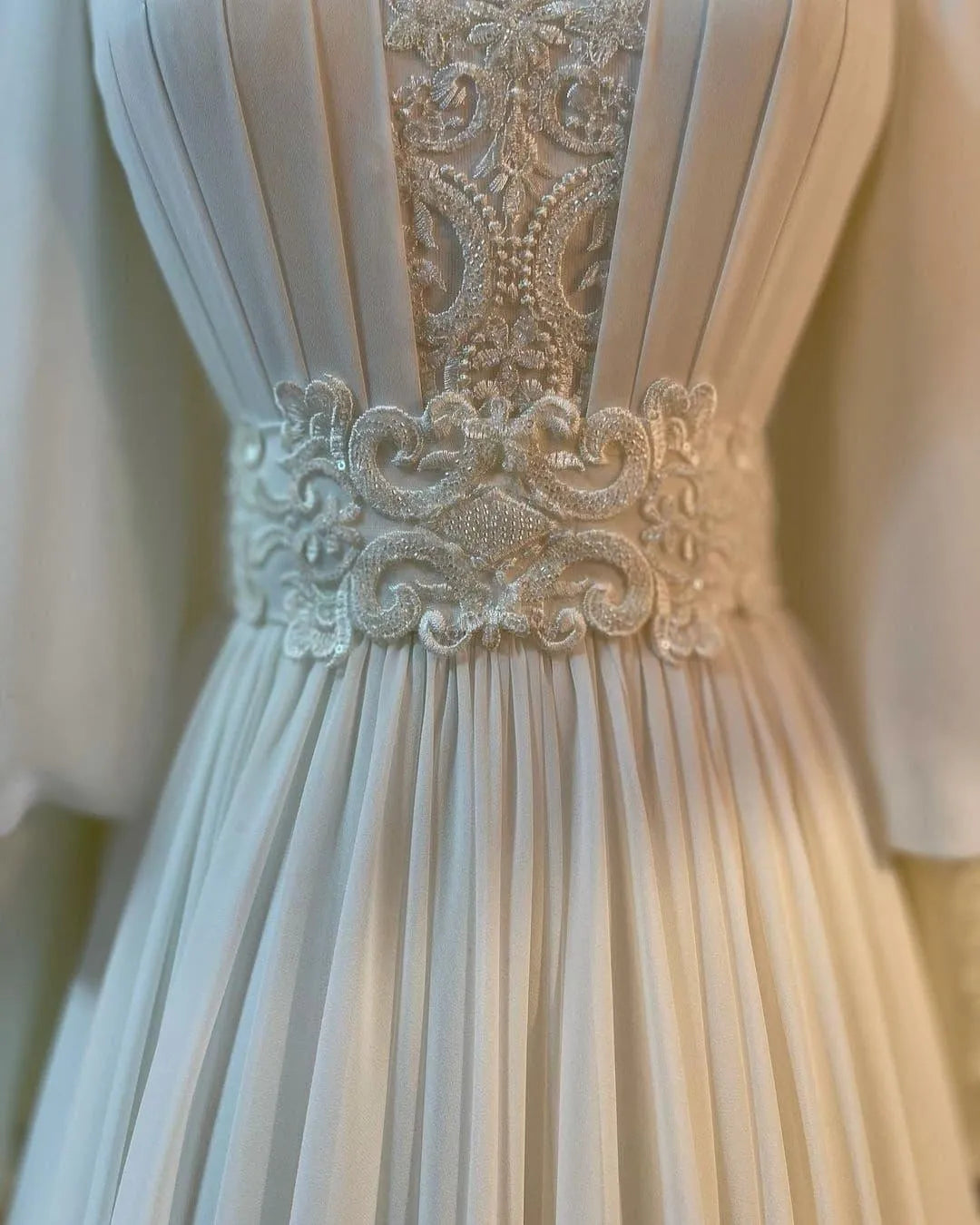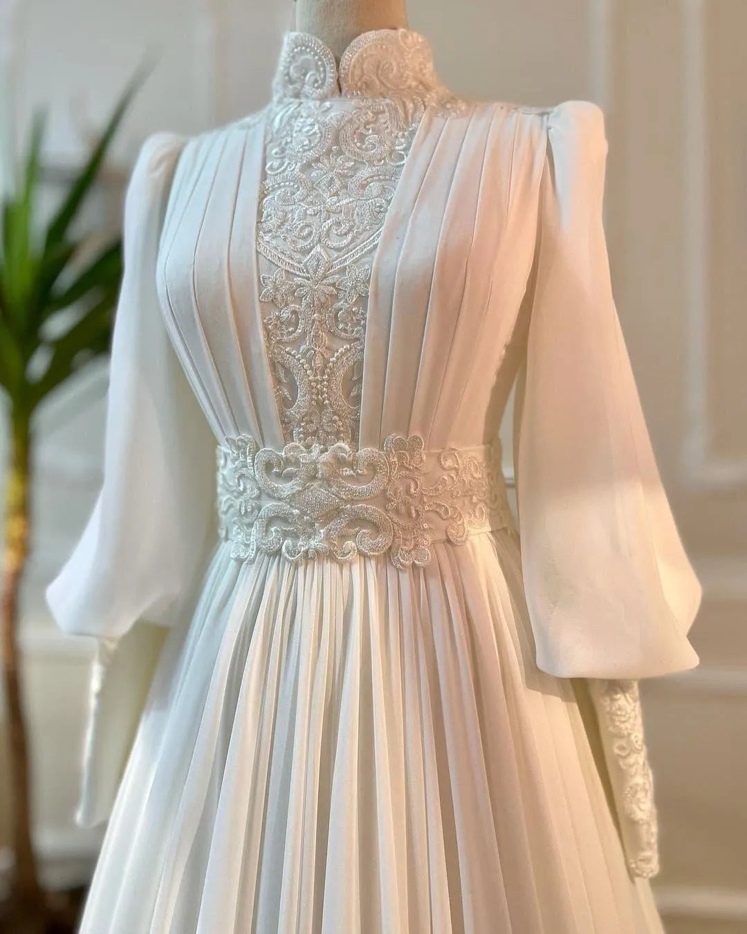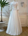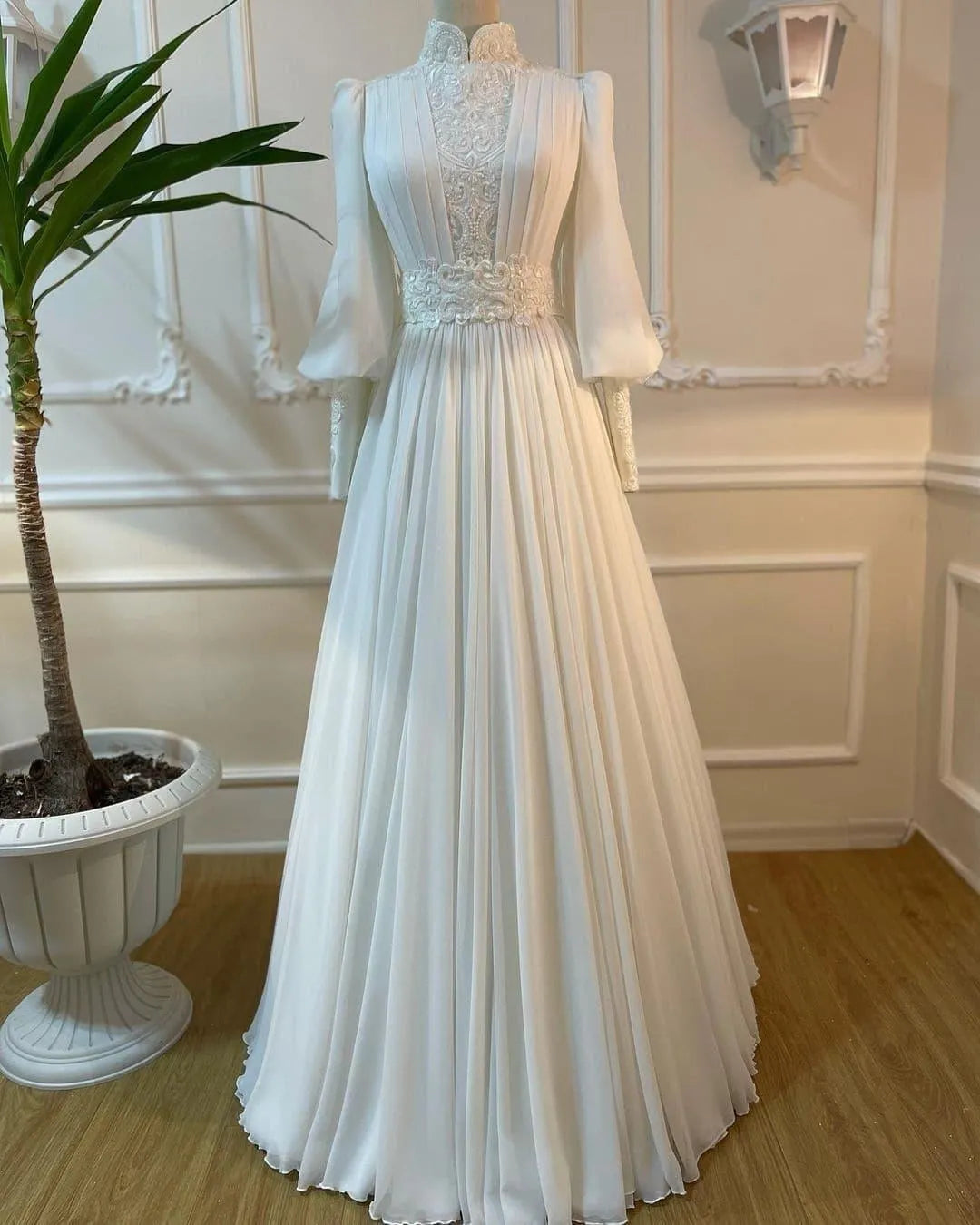 Vestidos de noiva muçulmanos de renda francesa para mulheres com contas em linha A, chiffon, vestido de noiva Dubai, mangas compridas, vestidos de novia