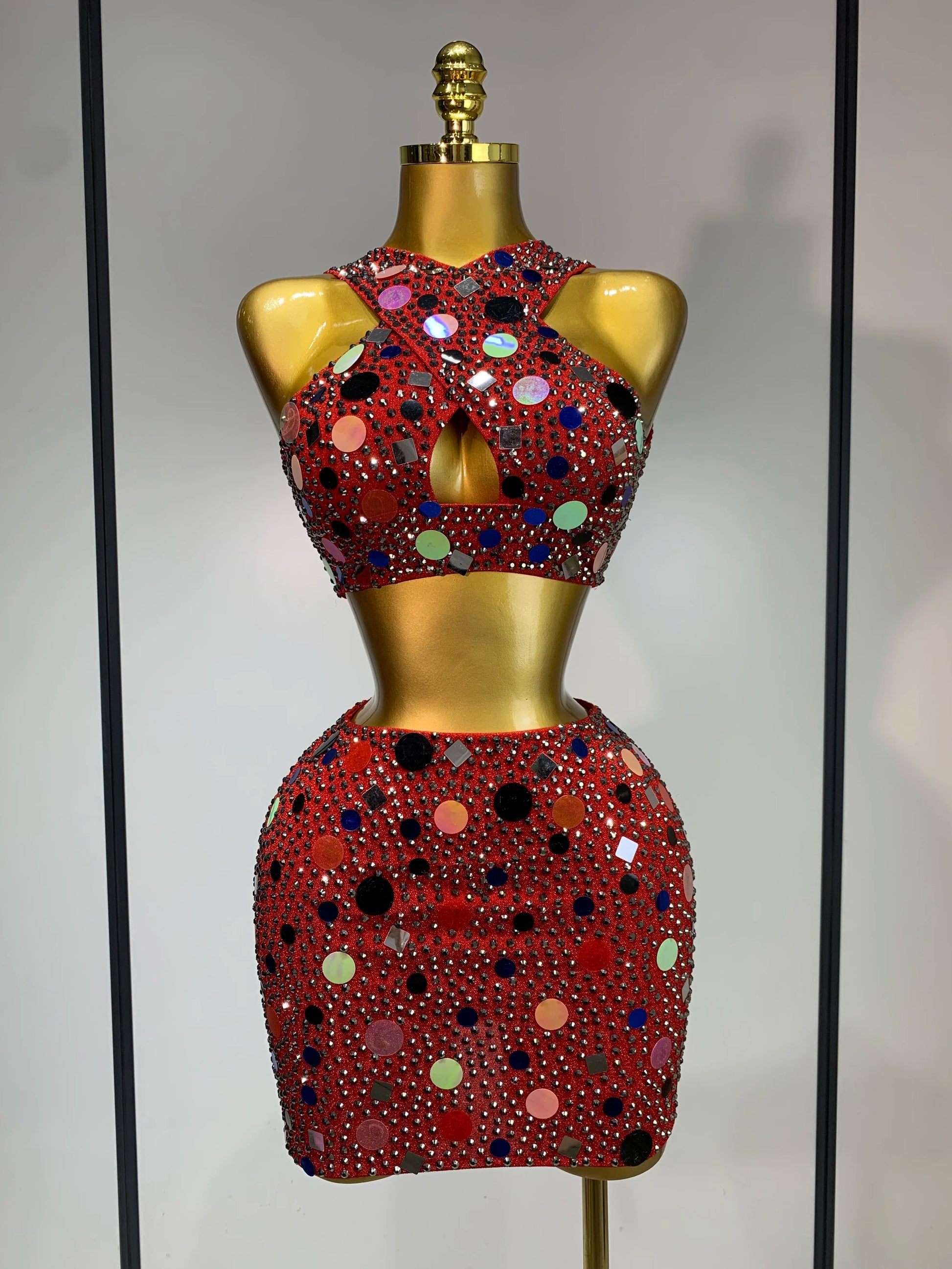 Luxury Rhinestone Sequin Sexy Two Piece Set 2025 New Fashion Nightclub Sparkly Perform Stage Costume Birthday Dress
