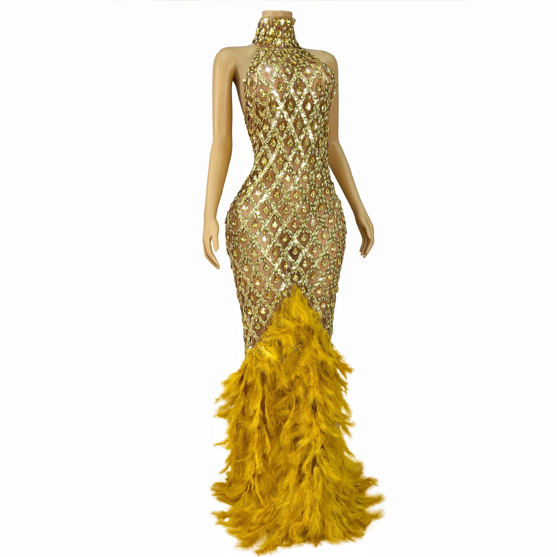 Luxury Shining Gold Rhinestones Feather Sexy Mesh Long Dress Women Birthday Evening Red Carpet Fashion Show Gown Stage Costume