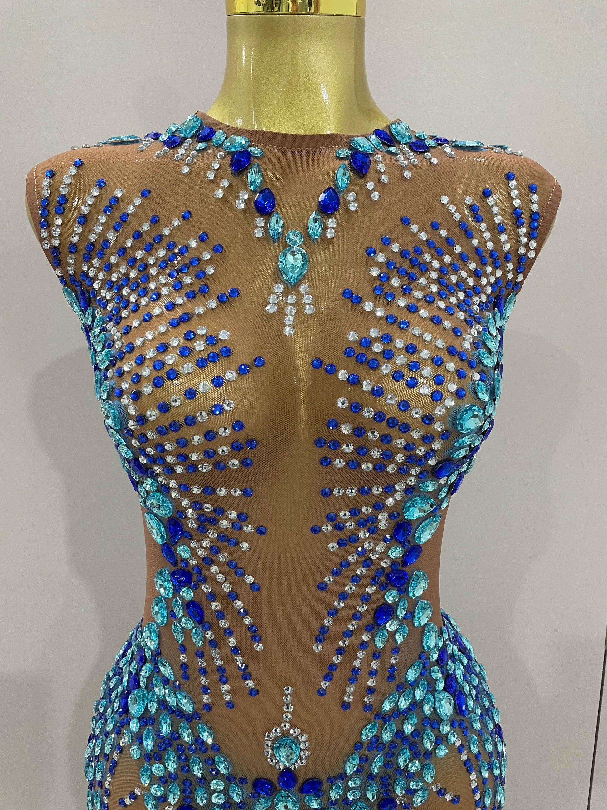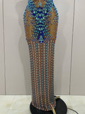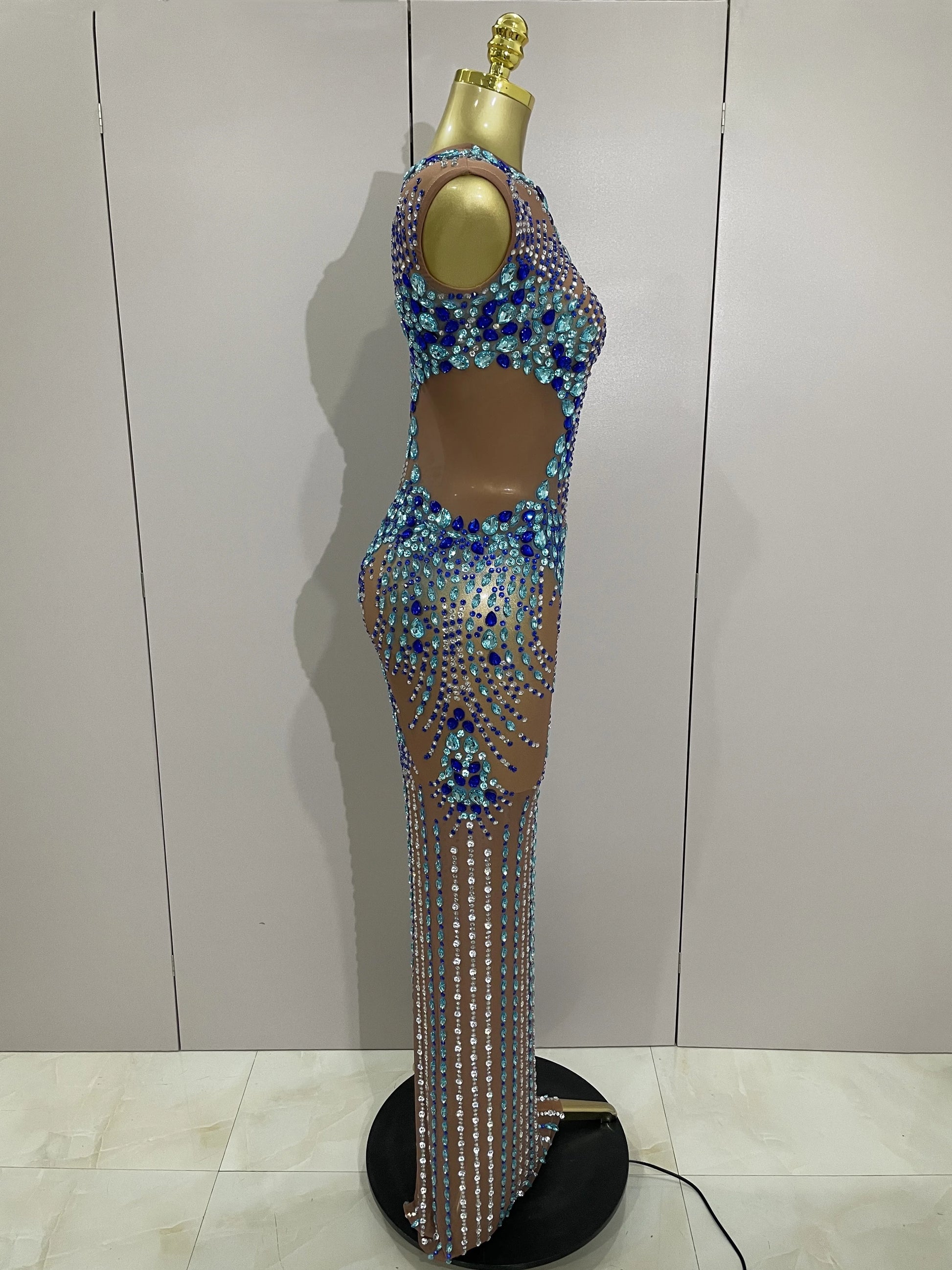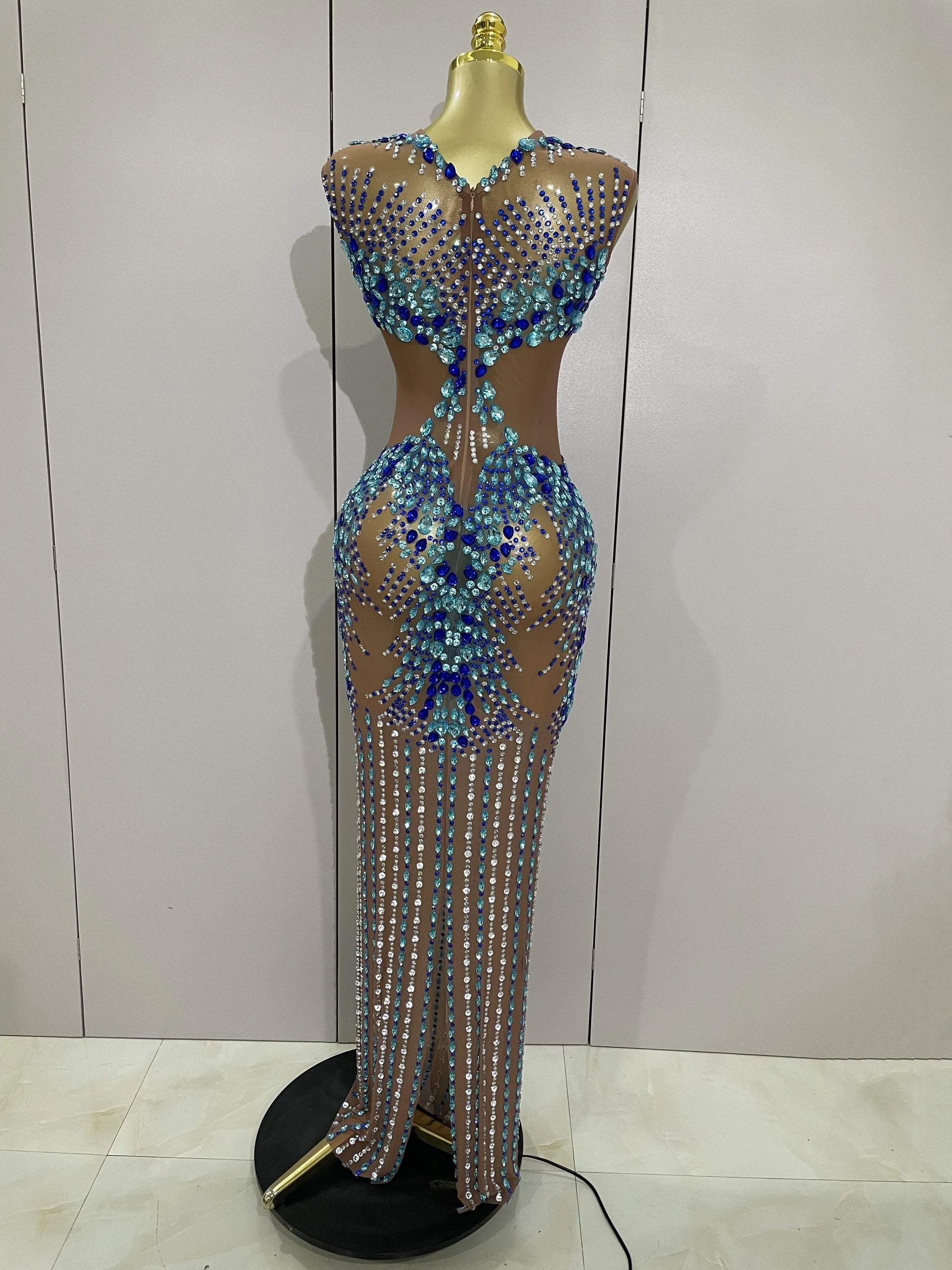 Luxury Sparkly Rhinestones Nude Sexy Mesh Maxi Dress 2025Women Evening Birthday Party Elegant Gown Show Red carpet Stage Costume