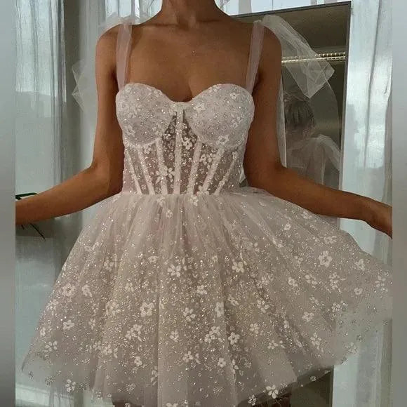 Mini vestidos de noiva com flores em forma de coração, corpete de tule, vestidos curtos para festa de casamento, vestidos de coquetel para mulheres
