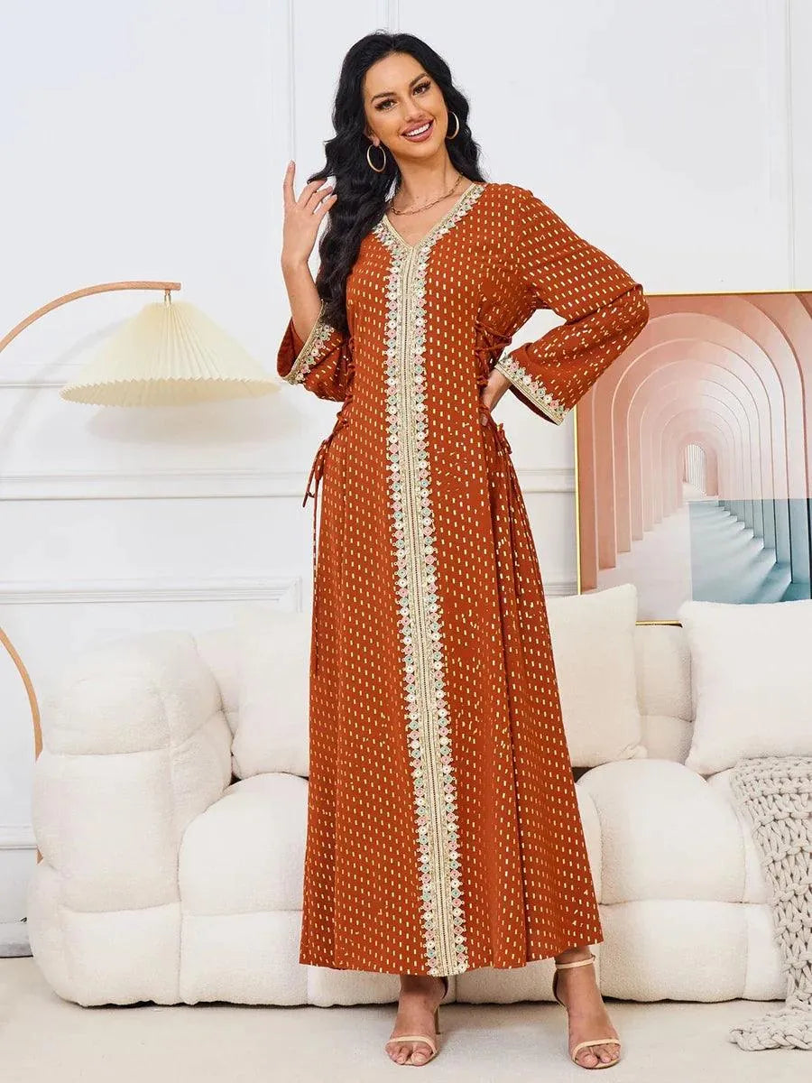 Moda Estampado em Ouro Cinto Abaya Dubai Roupas Islâmicas Guarnição de Fita Manga Longa Decote em V Elegante Vestido Feminino Árabe Caftan
