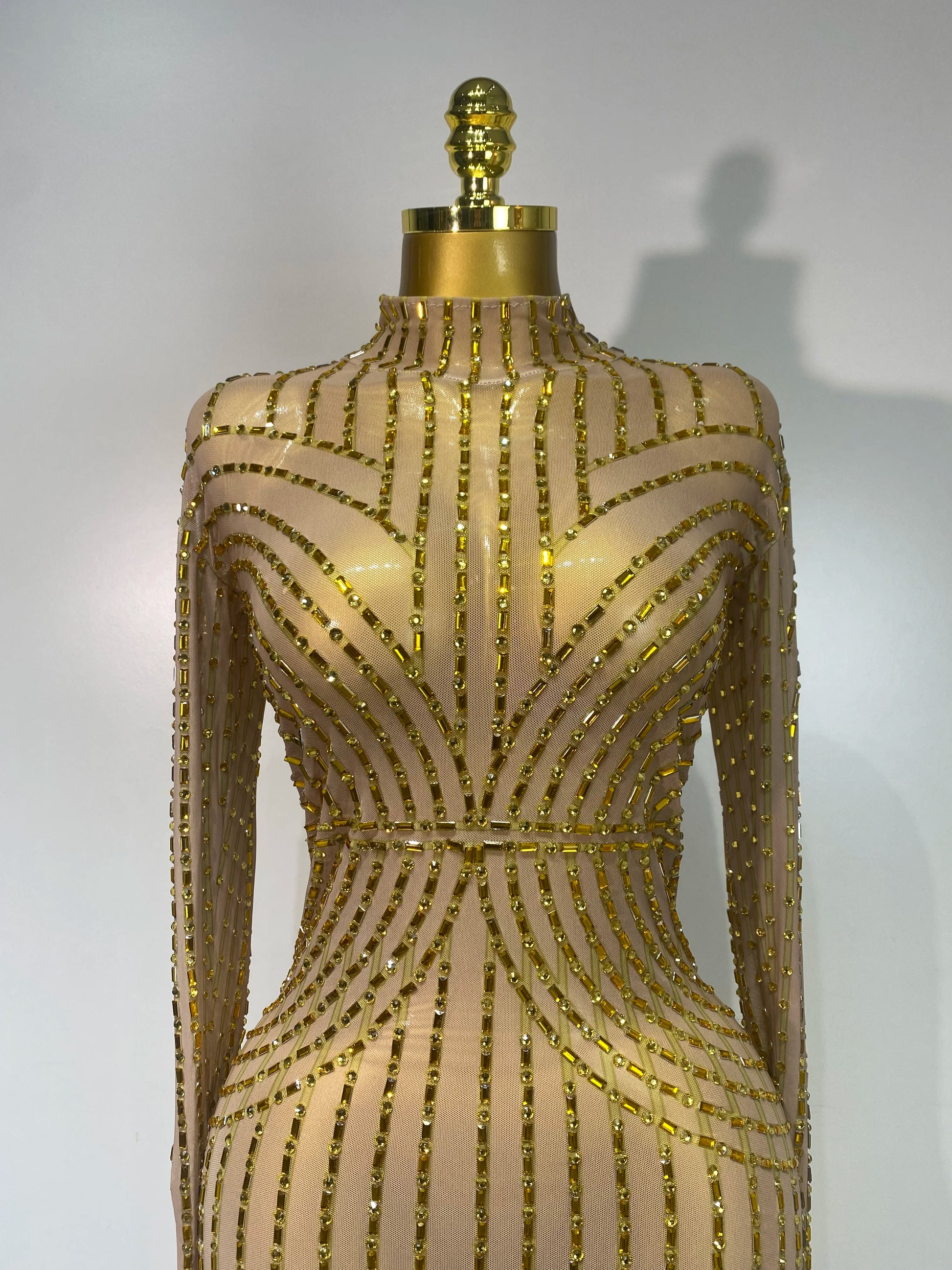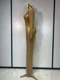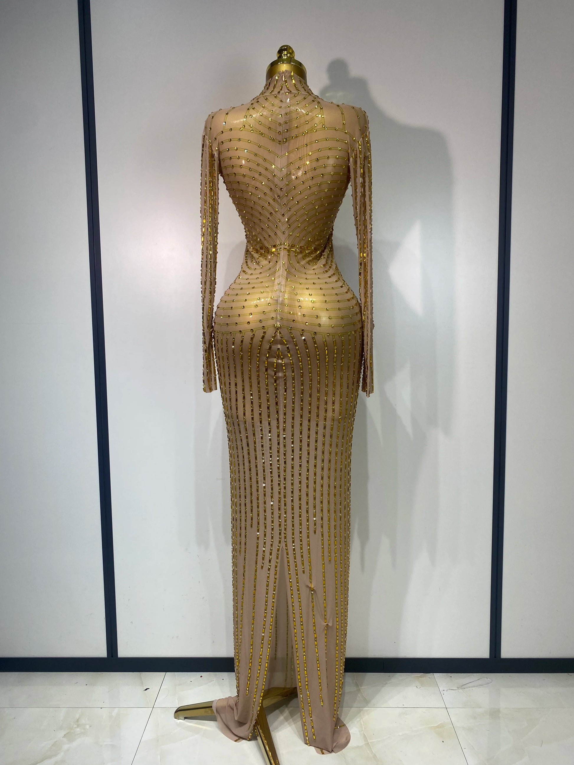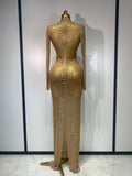Sexy Long Sleeve Mesh See Through Gold Silver Maxi Dress Evening Party Singer Costume Stage Performance Luxury Birthday Dress
