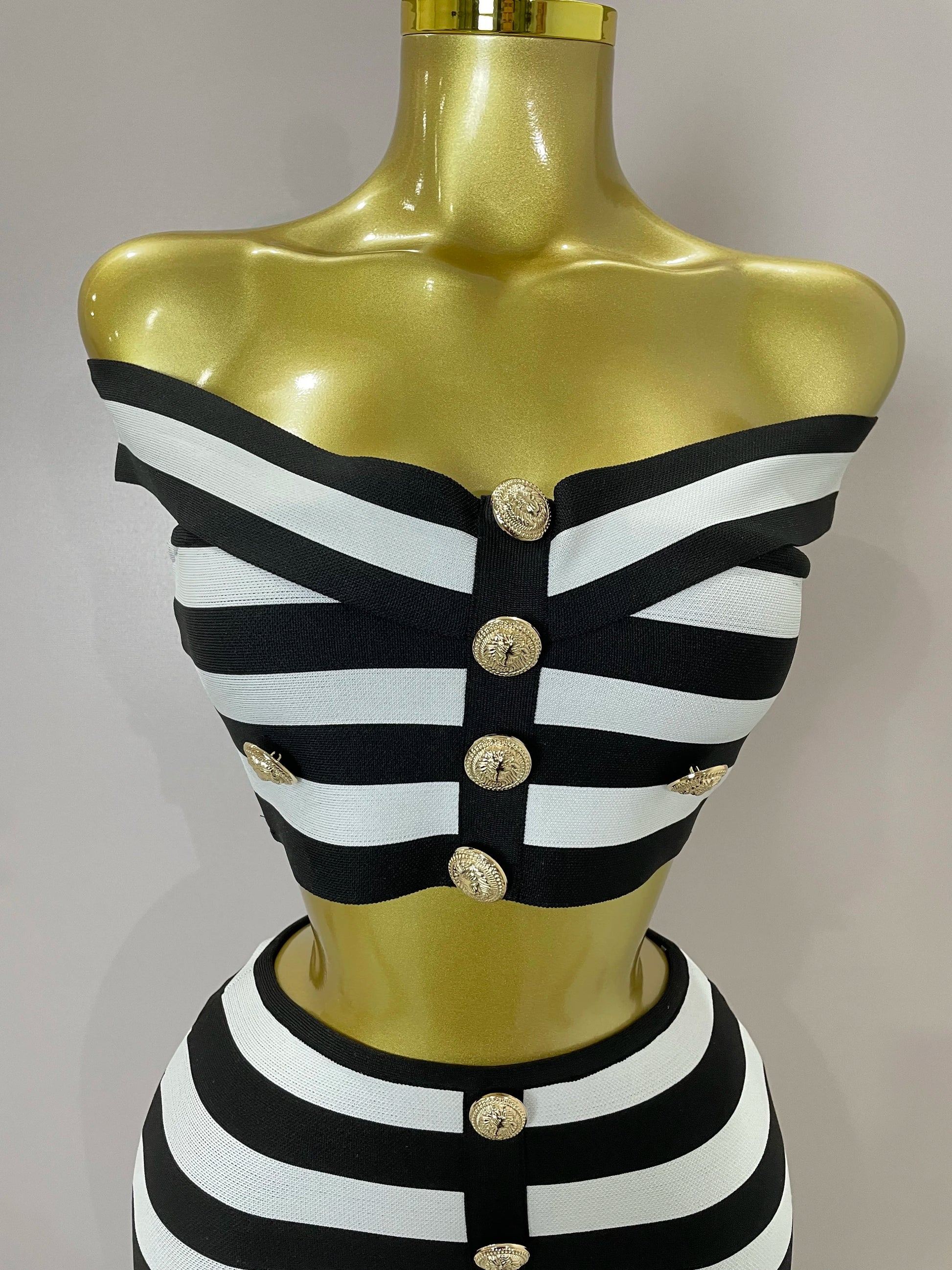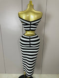 Sexy Off Shoulder Striped Button Two Piece Mini Bandage Set 2025 Women Celebrity Designer Evening Party Luxury Birthday Outfit
