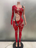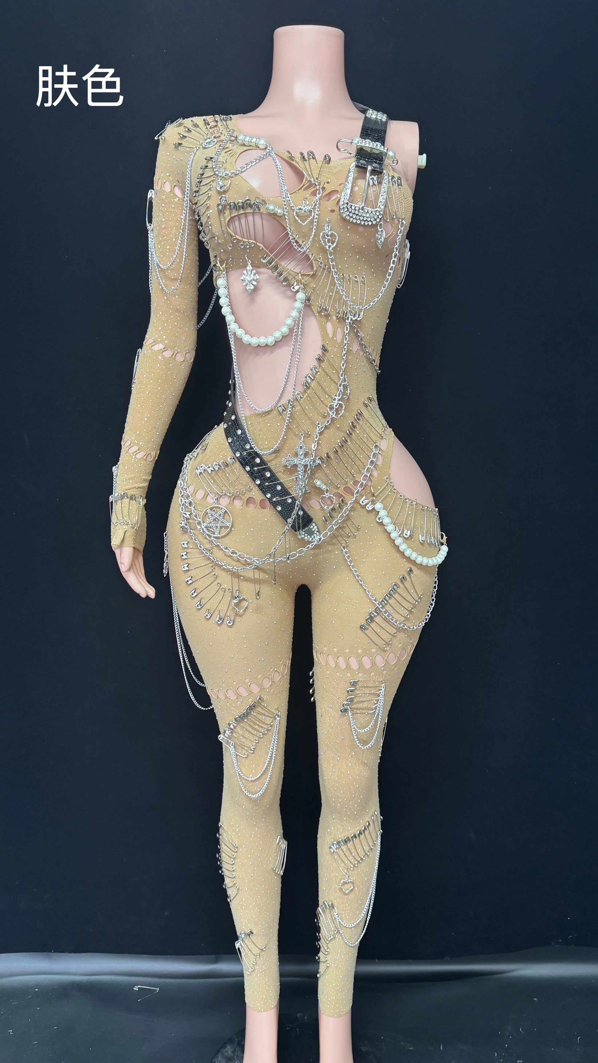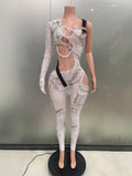 Sexy Shining Pearl Chain One Shoulder Hollow Out Jumpsuit 2025 New Women Birthday Party Nightclub Singer Performance Stage Wear