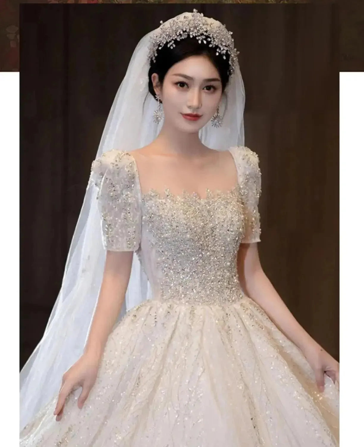 Vestido de noiva de manga curta com contas, novo vestido de noiva luxuoso com cauda grande, vestido de baile Tuller, vestidos de noiva