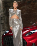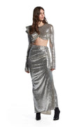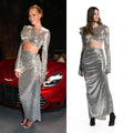 Silver Color Women Long Sleeve Sexy 2 Pieces Shinning Sequins Bodycon Long Dress Celebrity Fashion Evening Party Dress