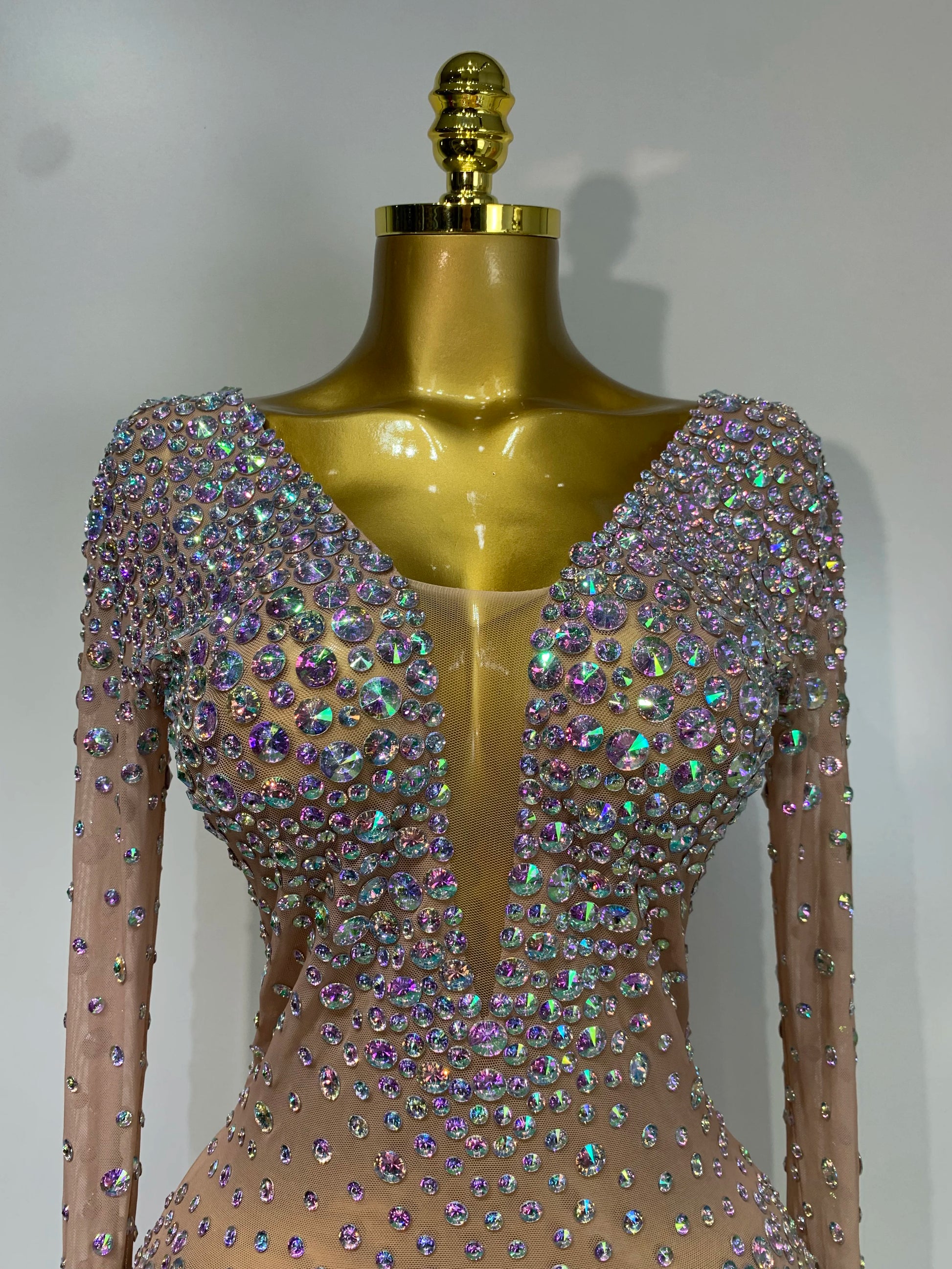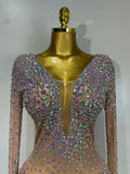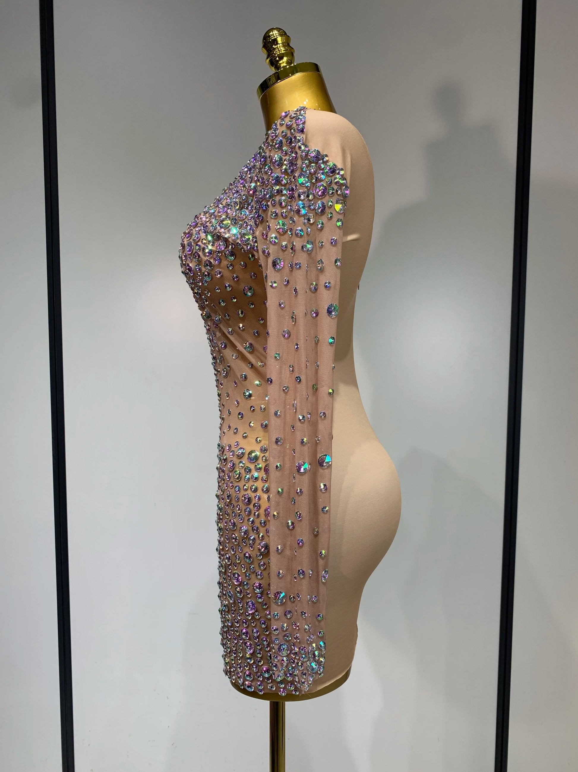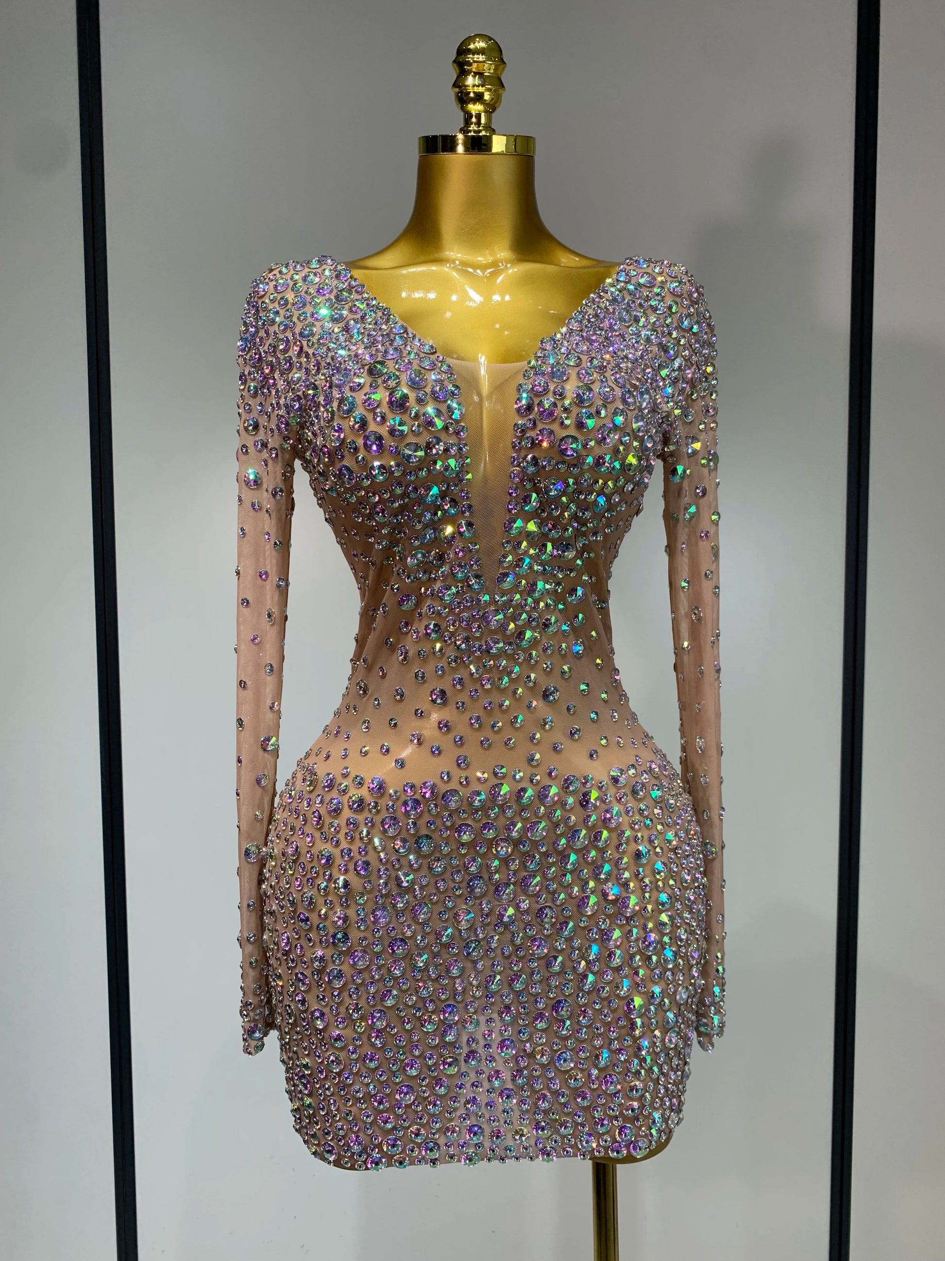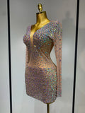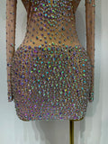 Sparkly Luxury Rhinestones Colourful Mini Dress Women Sexy Mesh See Through Birthday Performance Costume Dancer Stage Wear