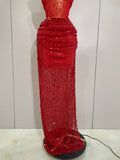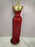 Sparkly Red Rhinestones Sequins Sexy See Through 2PCS Long Dress 2025Women Celebrate Evening Birthday Party Dress Stage Costumes