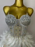 Stock 2025 Women Sexy Sparkly Rhinestone Mesh Feather Long Dress Elegant Evening Party Celebrate Birthday Performance Costume