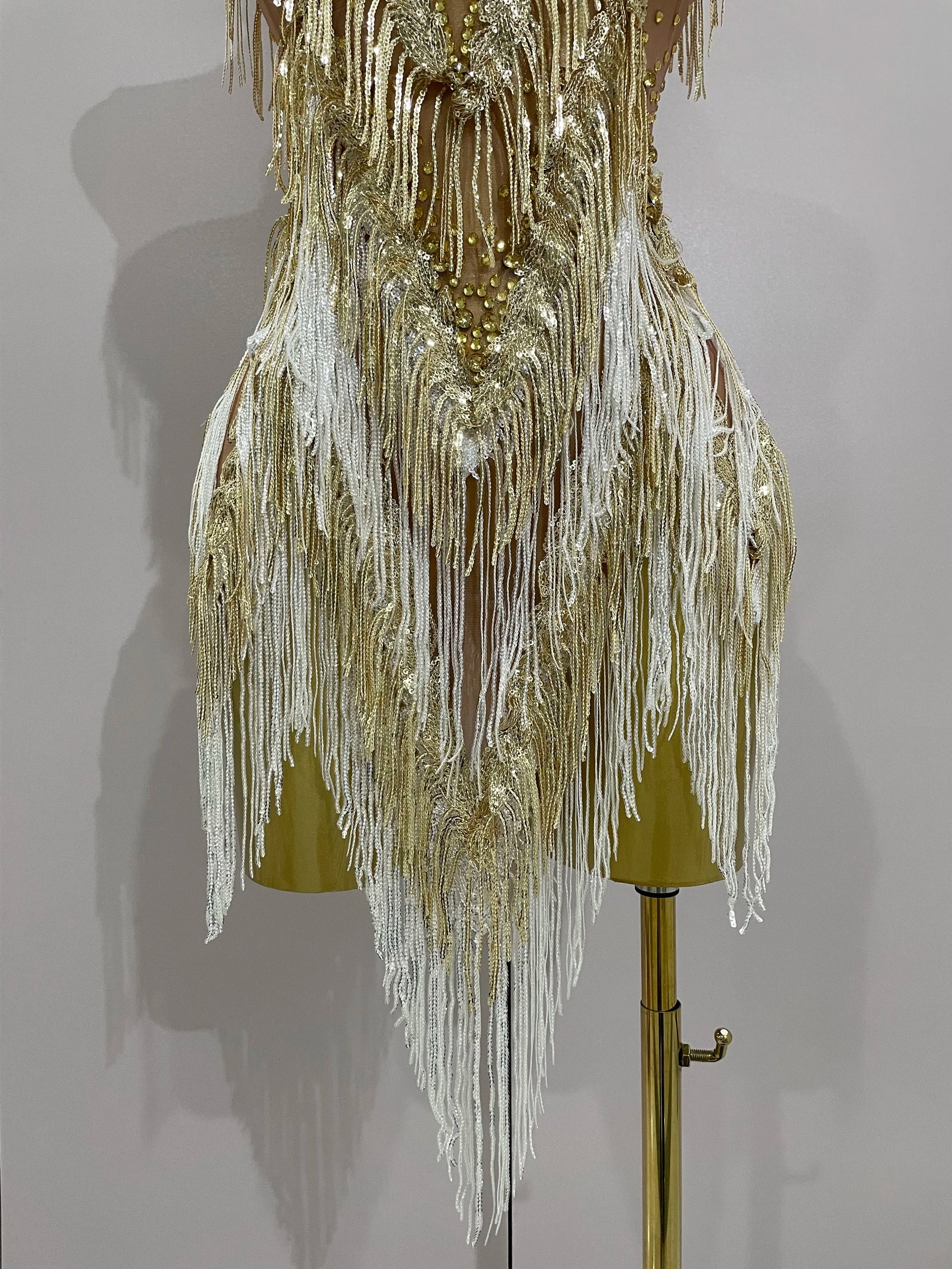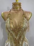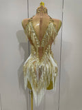 Stock 2025 Women Sexy Stretch Mesh Sparkly Rhinestone Tassels Mini Dress Nightclub Singer Dance Stage Costume Evening Gowns