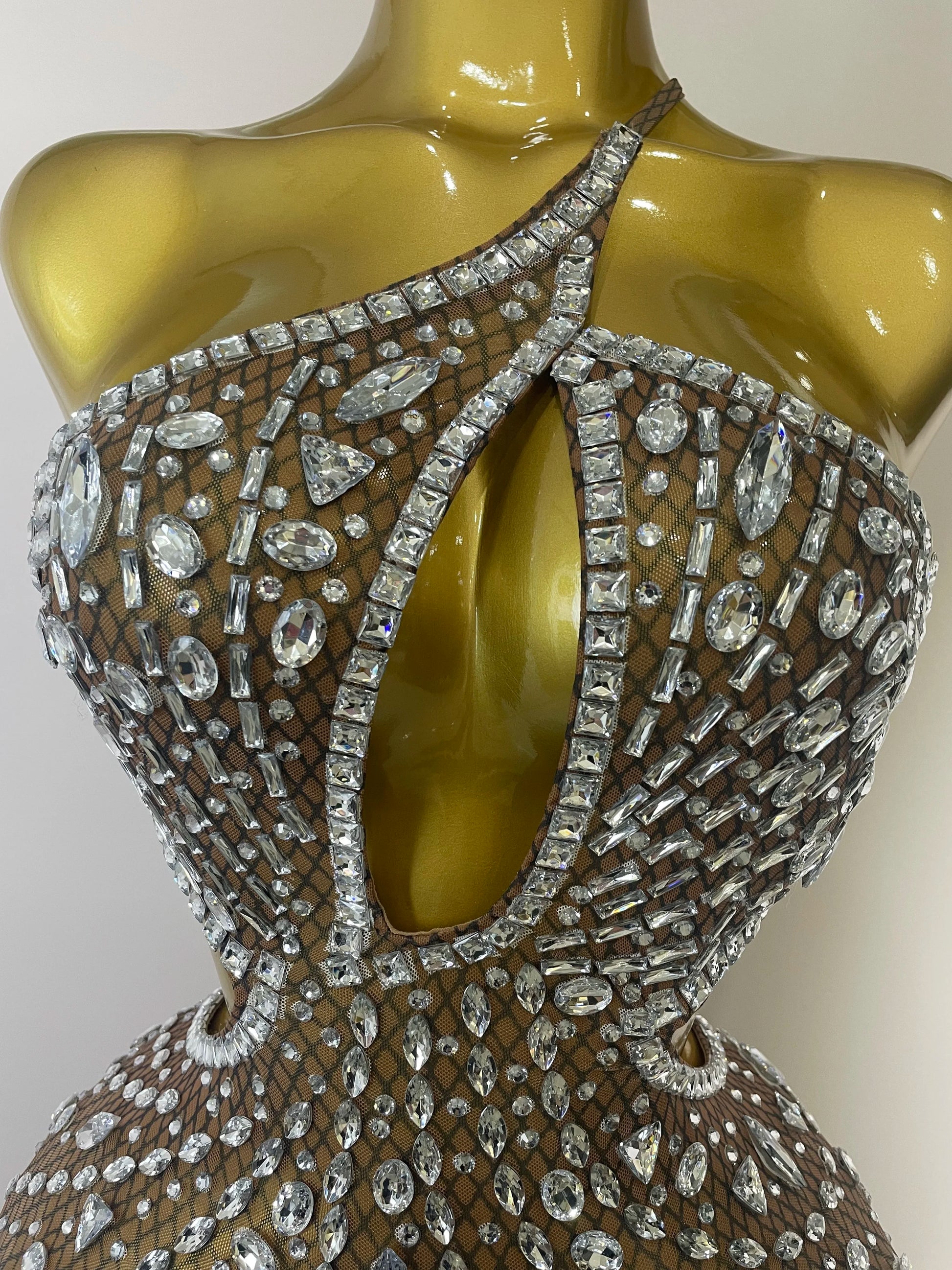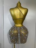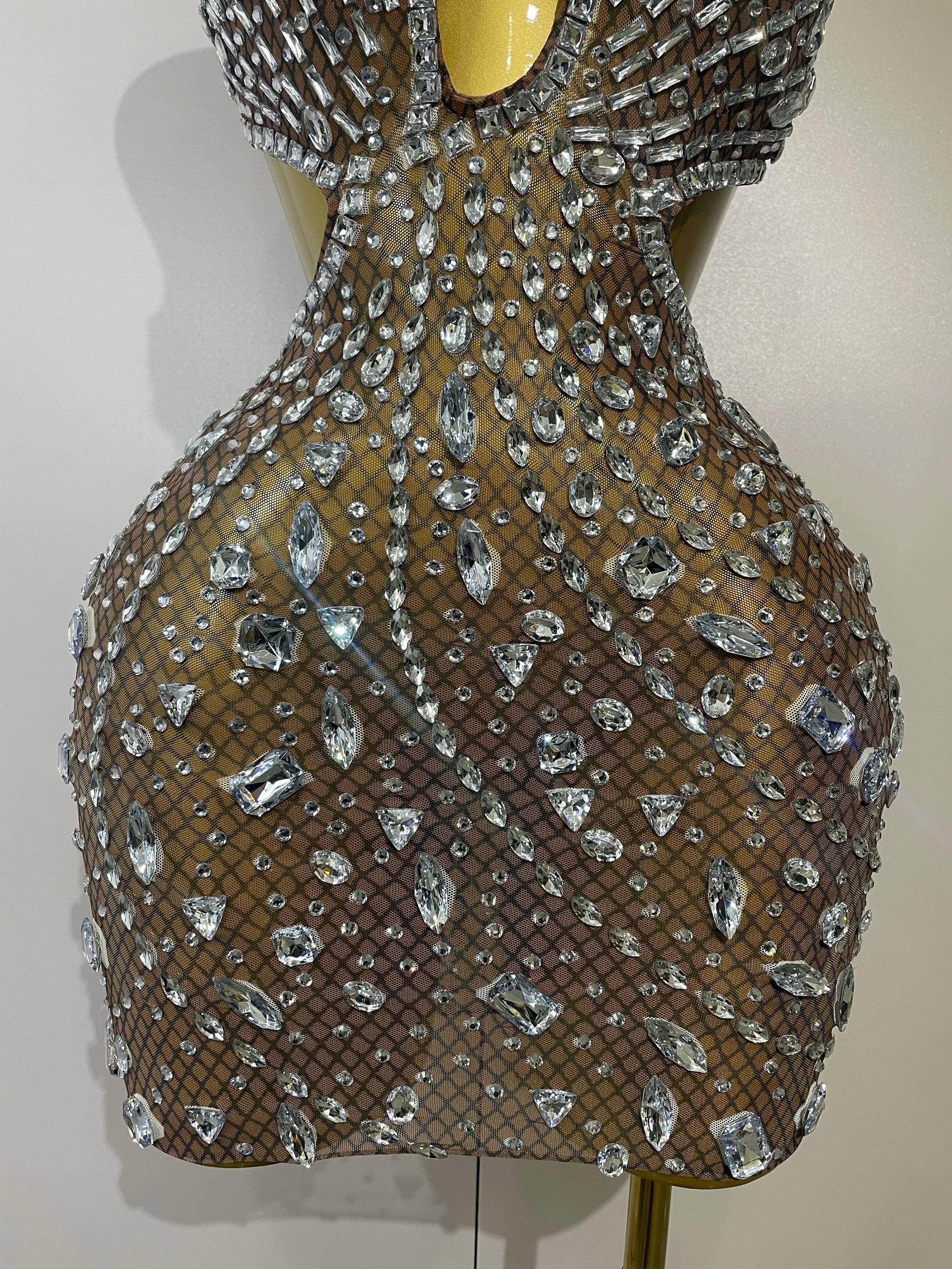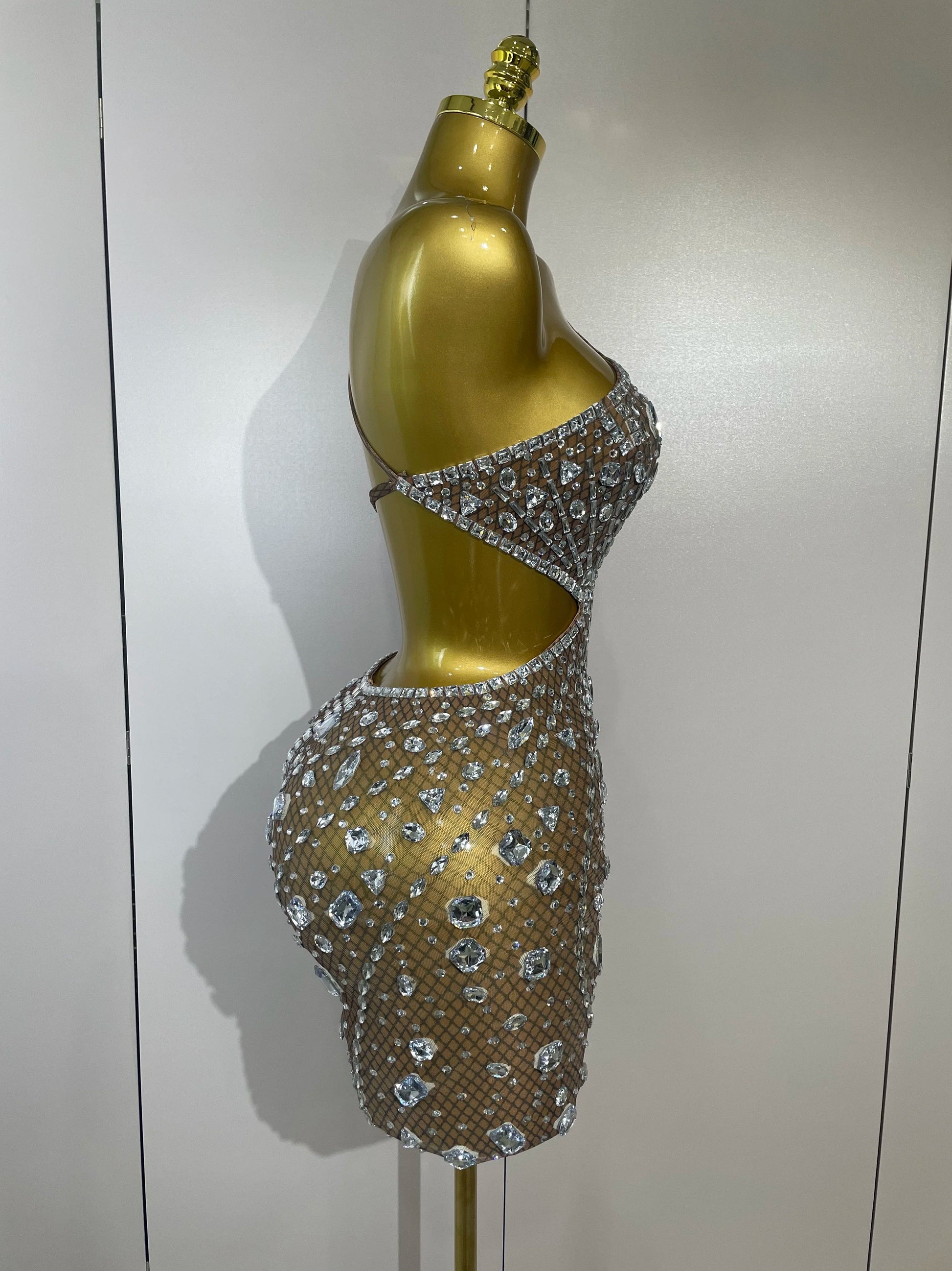 Stock Women Sparkly Big Crystal Sexy Off the Shoulder Mesh See Through Mini Dress Nightclub Party Celebrate Birthday Dress