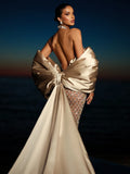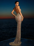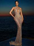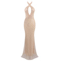 VC Beige Halter Mermaid Long Dress Key Hole Backless Sequins Sleeveless Celebrity Maxi Evening Party Gowns Vestidos