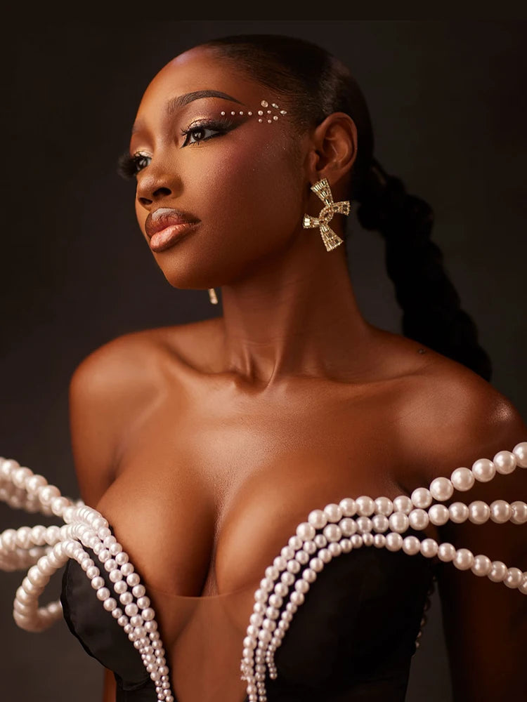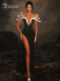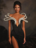 VC Chic Off-Shoulder Black Maxi Dress with Pearl Cut out High Slit Design for Gala Party Glamorous Gown