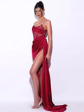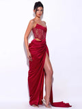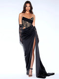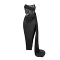 VC Cocktail Party Dress Women Sexy High Split Evening Clubwear Strapless Lace Patchwork Satin Long Dress Vestidos