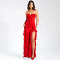 VC Cocktail Party Dress Women Sexy Strapless Stereo Flowers Fashion Ruffles Solid Color High Split Long Gowns