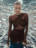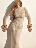 VC Mesh Ruched Long Dress For Women Fashion Zipper Patchwork See Through Long Sleeves Pleated Cocktail Club Party Wear