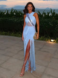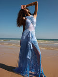 VC Sleek Light Blue Sleeveless Dress with Fringe Ruched Waist And Mesh Detail Soft Summer Vacation Gown for Women