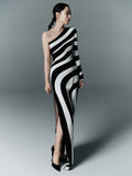 VC Women Sexy One Shoulder Striped High Split Jacquard Maxi Bodycon Bandage Long Dress Celebrity Evening Party Gown