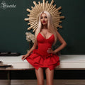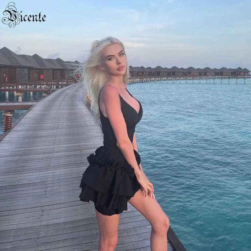 VC Women White Mini Dress Sexy Spaghetti Strap V Neck Ruffles Dress Celebrity Christmas Party Bandage Vestido