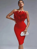 Vestido Bandage Vermelho Feminino Vestido de Festa de Penas Bodycon Elegante Midi Sexy Sem Alças Noite Aniversário Clube Roupas Verão 2023
