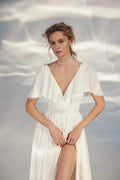 Vestido de noiva elegante em corte A com decote em V e ombros à mostra e uma cintura natural lisonjeira – Vestido de noiva simples, mas sofisticado