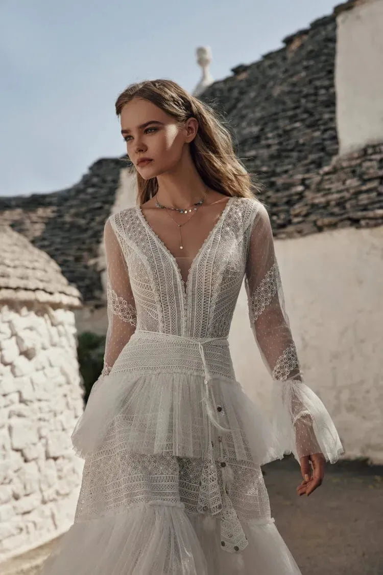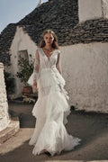 Vestido de noiva elegante na praia com mangas compridas, decote em V e renda intrincada para um visual de noiva romântico e de tirar o fôlego