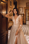 Vestido de noiva etéreo em corte A com corpete de renda delicada, apliques florais 3D e detalhes de lantejoulas brilhantes para um visual romântico e sonhador