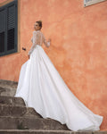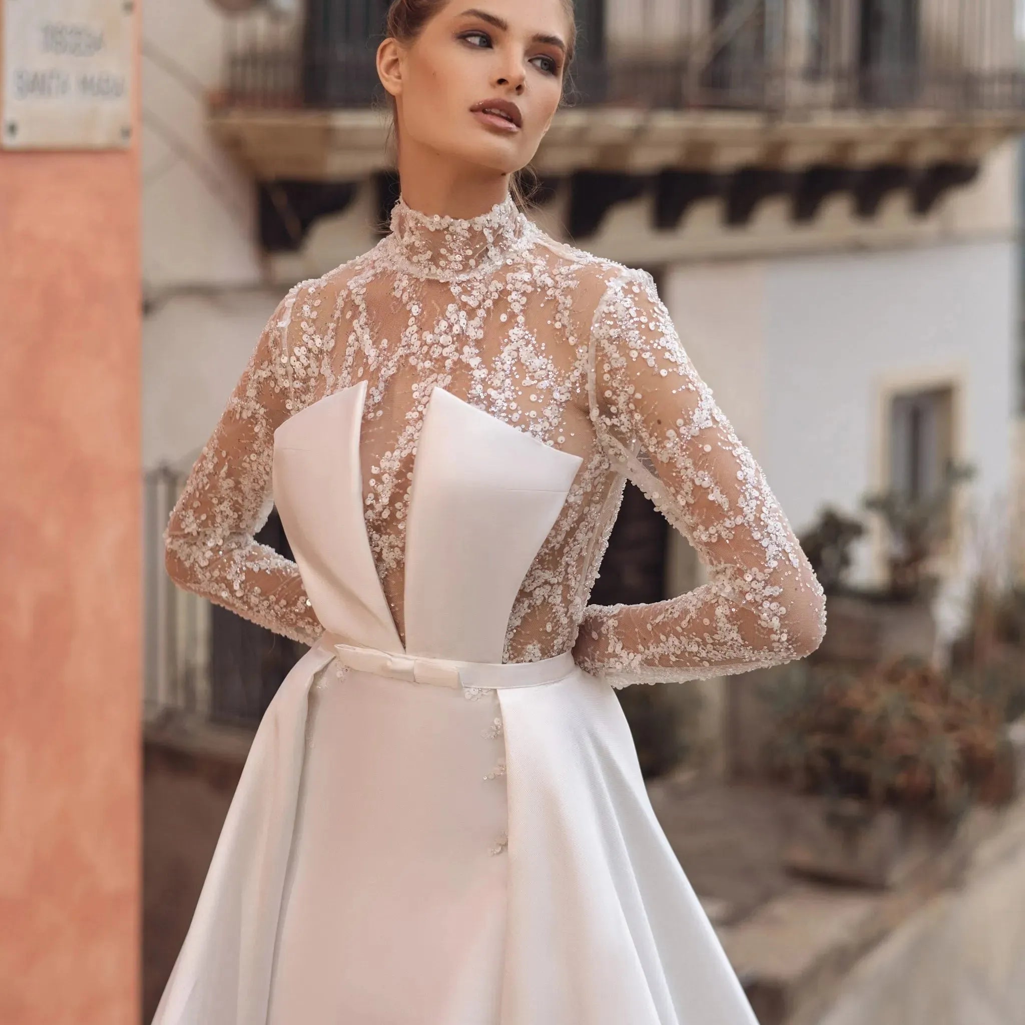 Vestido de noiva etéreo em corte A com mangas longas graciosas, decote em V lisonjeiro e renda luxuosa com miçangas para um visual nupcial romântico e atemporal